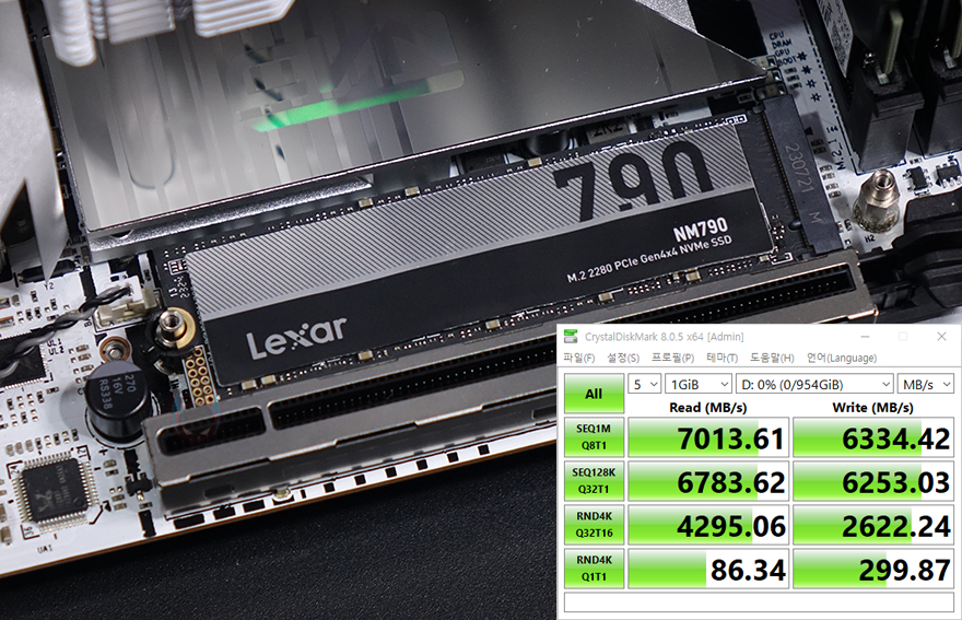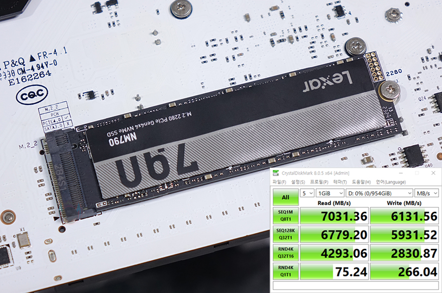 끝으로, CVN B760I FROZEN WIFI D5 메인보드에는 앞서 확인했듯이 전면과 후면에 각각 M.2 SSD 슬롯을 하나씩 갖추고 있습니다. 슬롯 모두 PCIe 4.0x4 규격까지 지원하는데, 실제 PCIe 4.0x4 규격의 NVMe SSD는 장착해 성능을 확인해보면, PCIe 4.0x4 규격에서 나올 수 있는 최대 읽기와 쓰기는 7000MB/s와 6000MB/s대로 CVN B760I FROZEN WIFI D5에서도 그대로 최대 속도를 발휘하는것을 확인할 수 있습니다.