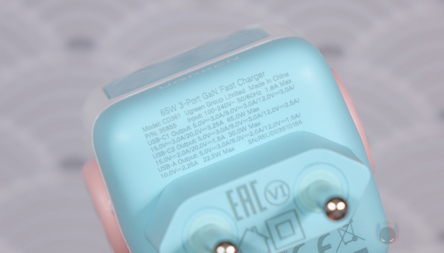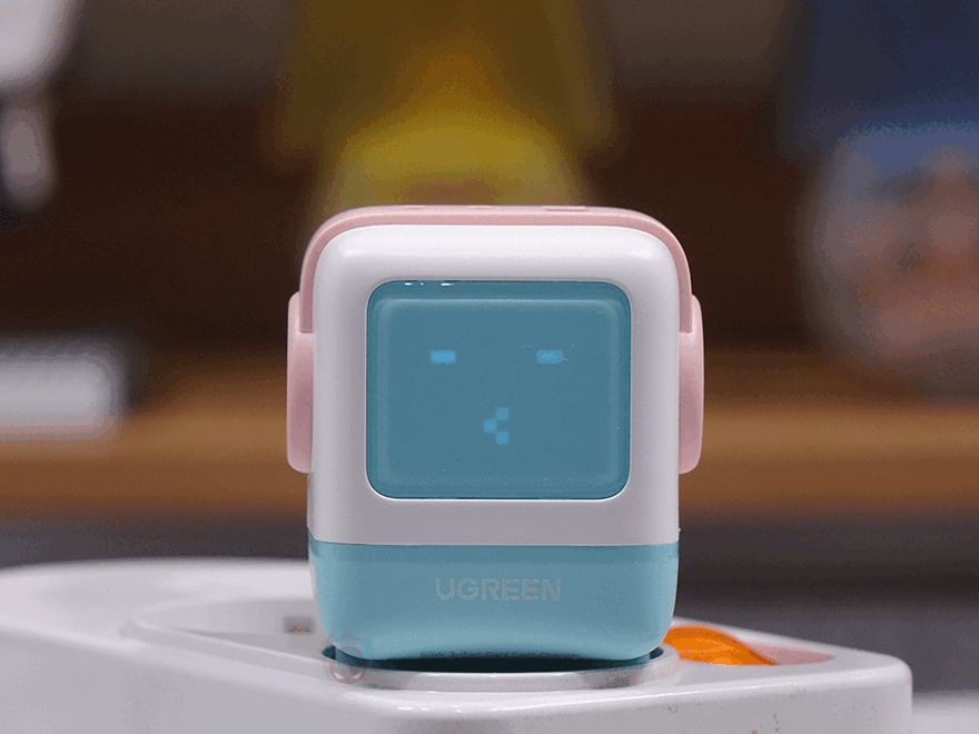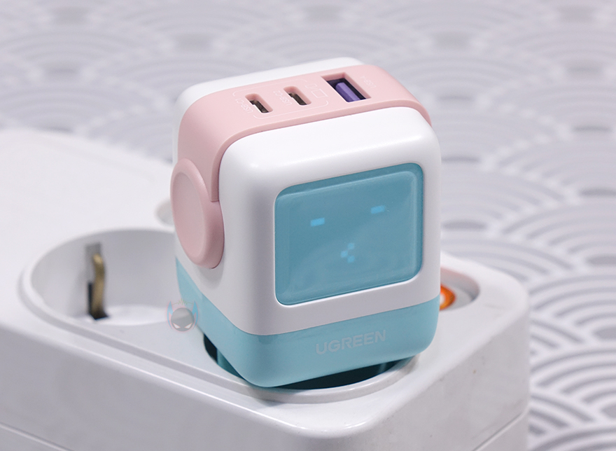직접, 유그린(UGREEN) Nexode RG 65W 핑크블루 충전기를 사용해 보면, 블랙/퍼플 색상 모델에 이어 색상만 추가된 모델이라 작동은 동일합니다. 일단, 전원이 들어오면 전면에 이모티콘을 확인할 수 있으며, 외부 디바이스를 충전하게 되면 웃는 이모티콘으로 바뀌게 되죠. 그리고, 앞서 언급했듯이, 3개의 USB 충전 포트 중 1번 C포트는 최대 65W까지 충전 지원하며, 2번 C포트도 최대 30W까지 지원합니다. 참고로, A포트는 22.5W까지 지원하죠.