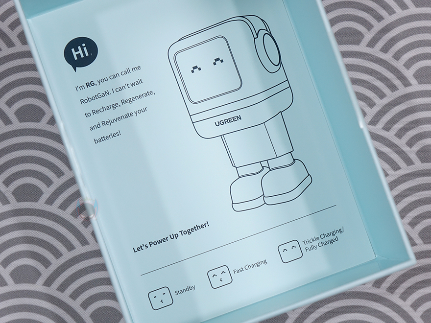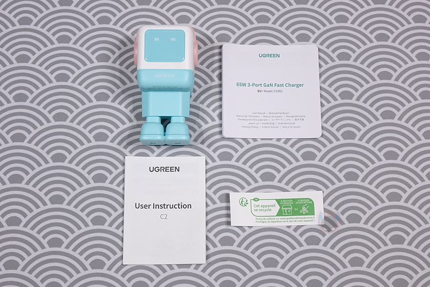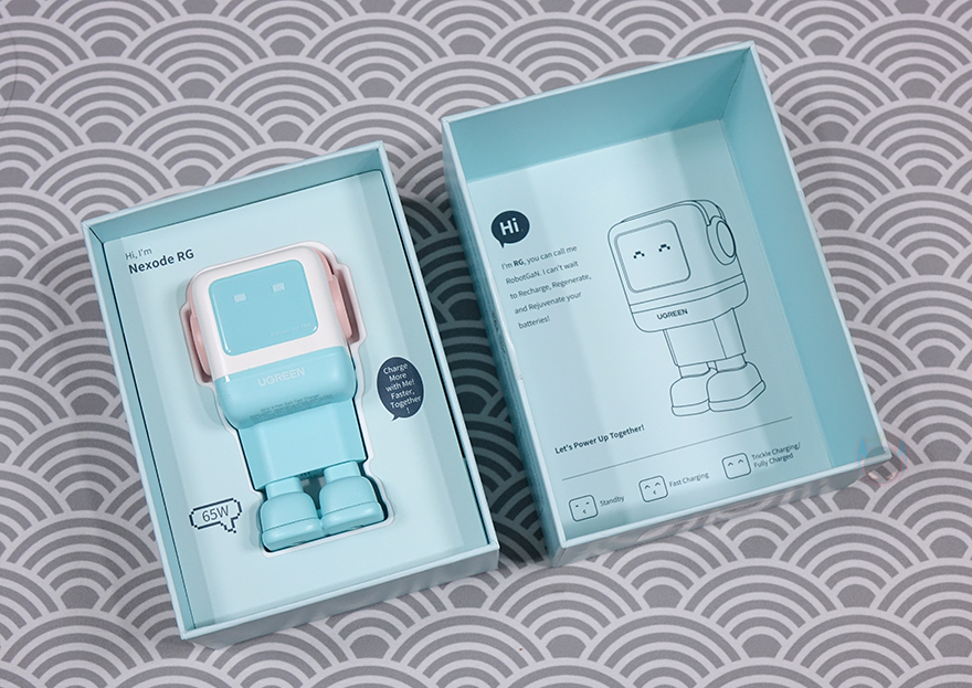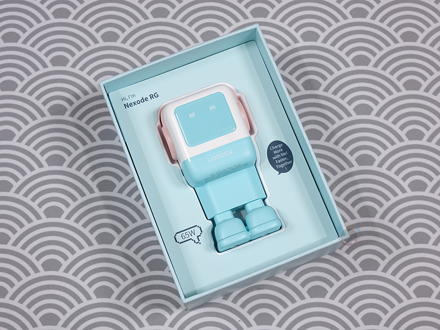 박스 후면 역시 먼저 나왔던 제품들과 마찬가지로 65W 고속충전과 호환성, GaN 충전방식, 포트 사용에 따른 자동 전력 분배 기능 탑재에 대한 언급을 담고 있으며, 박스를 열어보면, 안쪽에 이모티콘 안내 문구를 다시 확인할 수 있죠. 제품 구성 역시 먼저 나왔던 블랙/퍼플 색상 모델과 동일하게 색상만 바뀐 핑크블루의 Nexode RG 65W 고속충전기와 제품 설명서, 보증서로만 이루어져 있습니다.