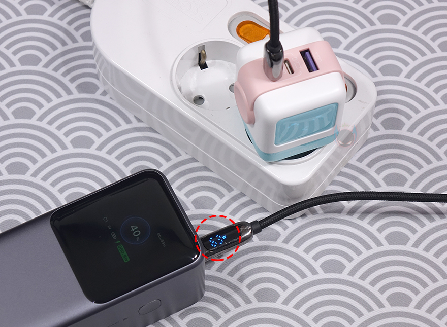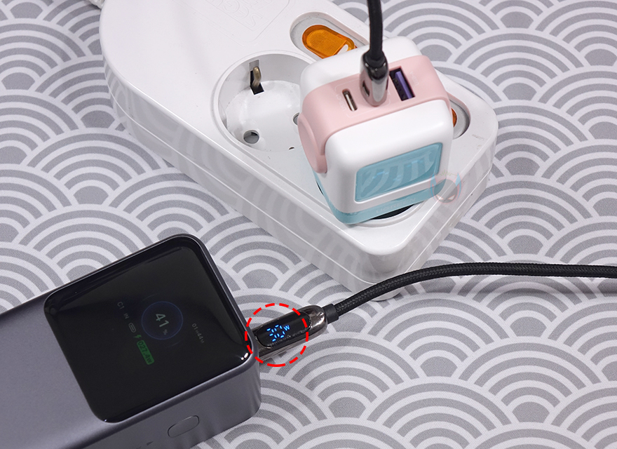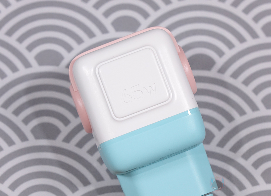 좀 더 자세히 살펴보면, 전면에 이모티콘 LED 디스플레이 크기는 동일하며, 디스플레이 배경도 색상에 맞춰 블루계열로 적용했습니다. 그리고, 상단에는 3개의 포트가 배치되어 있는데, USB 타입 C포트 2개, A포트 1개로 1번 C포트는 단일로 사용했을 때 최대 65W까지 지원하죠. 또한, 포트 부분의 디자인은 밝은 핑크색상으로 적용되었고, 후면에는 65W 표기를 확인할 수 있는데, 전체적으로 디자인 색상이 먼저 나왔던 블랙 색상 모델에서 색상만 변경되었다라는 걸 알 수 있습니다.