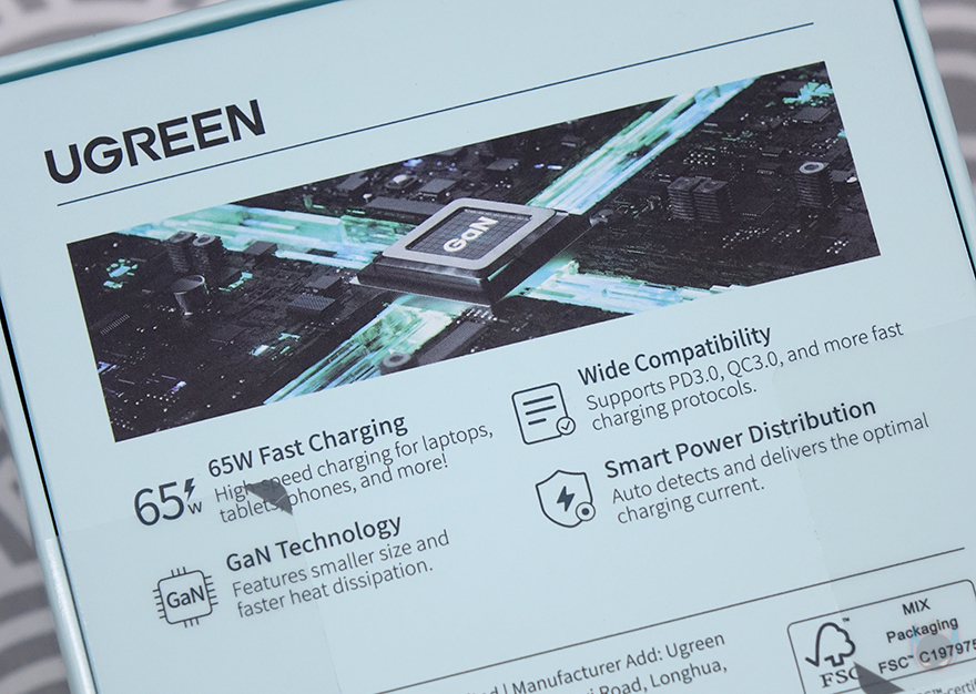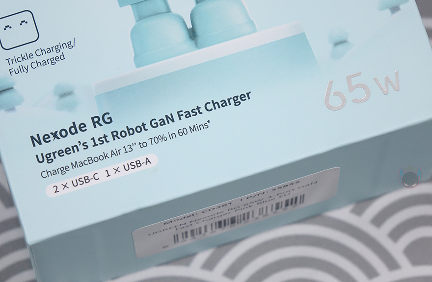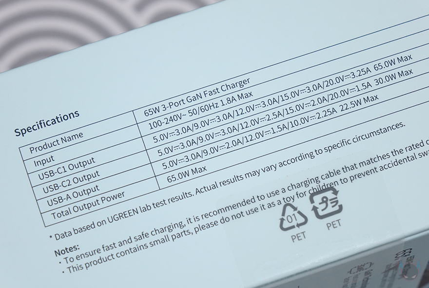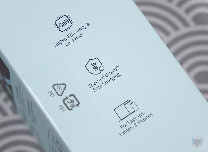 제품 박스부터 살펴보면, 색상이 새로 하나 더 추가된 모델이라 박스에 담긴 내용은 먼저 나왔던 블랙/퍼플과 동일합니다. 핑크블루 색상에 맞춰서 박스 배경색을 밝은 블루계열로 적용했으며, 전면에 제품 이미지도 색상에 맞춰 담고 있어서 어떤 색상의 제품인지 미리 확인할 수 있죠. 이밖에 충전상태를 이모티콘으로 알려주는 주요 특징 언급과 65W 충전 지원에 모델명도 추가로 확인할 수 있습니다. 또한, 박스 측면에는 GaN(질화갈륨) 충전방식 등의 주요 특징과 포트별 충전 속도 표기도 그대로 동일하게 표기해 놨죠.