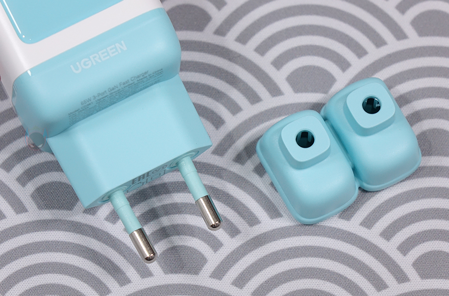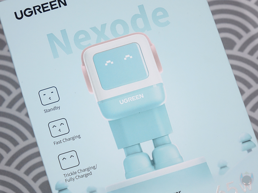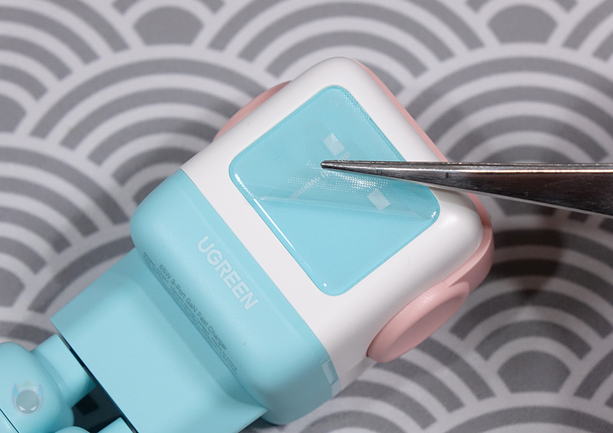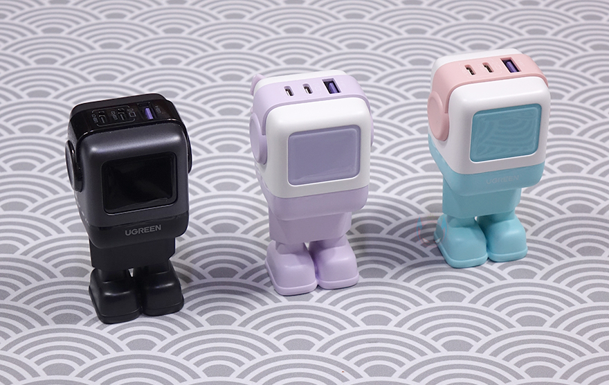 그럼, 유그린(UGREEN) Nexode RG 65W 핑크블루 고속충전기를 살펴보면, 개봉 시에는 블랙/퍼플 색상 모델과 마찬가지로 전면 이모티콘을 보여주는 디스플레이 부분에 보호비닐이 부착되어 있습니다. 그리고, 먼저 나왔던 블랙, 퍼플 색상 모델과 나란히 놓고 비교해 보면, 확실히 핑크블루 2가지 컬러가 적용된 모델이라 좀 더 눈에 띄는 느낌을 줍니다. 블랙이 남성 캐릭터 느낌이라면, 퍼플은 여성 캐릭터 느낌, 핑크블루는 발랄한 캐릭터 느낌을 줍니다.