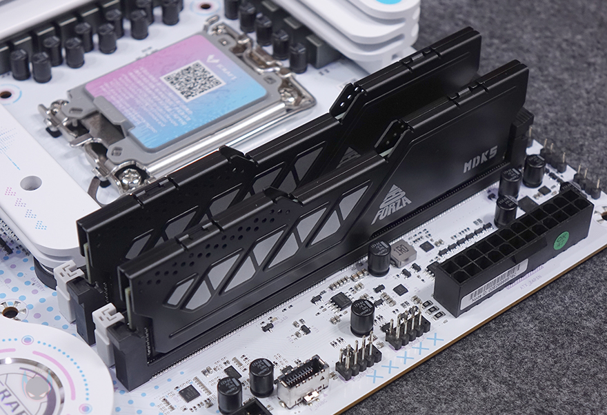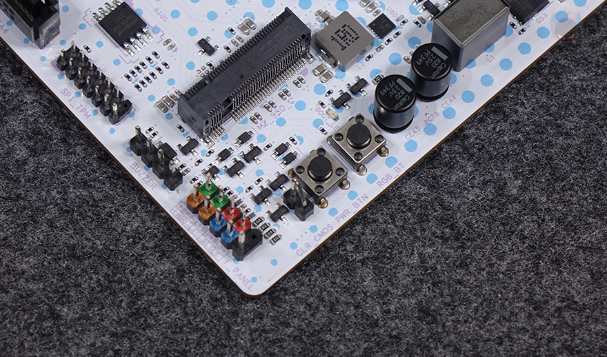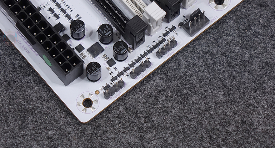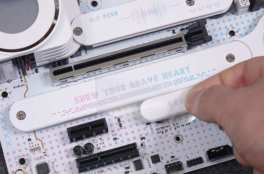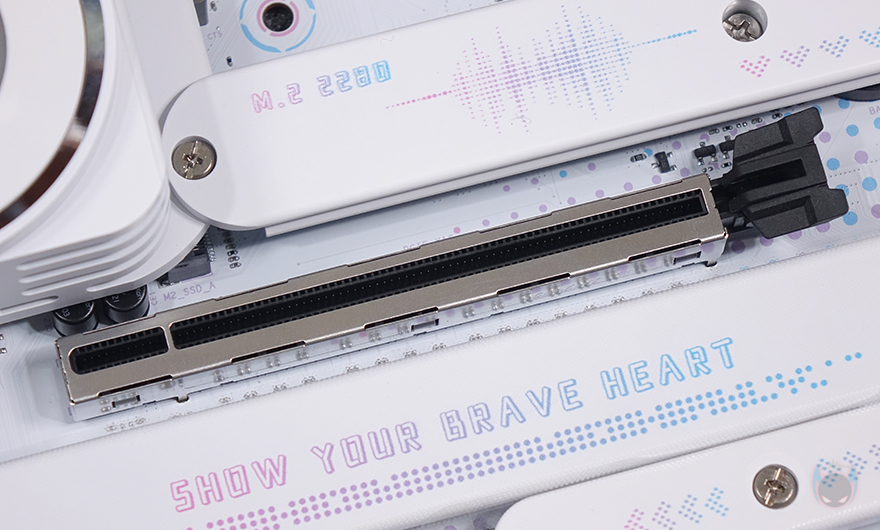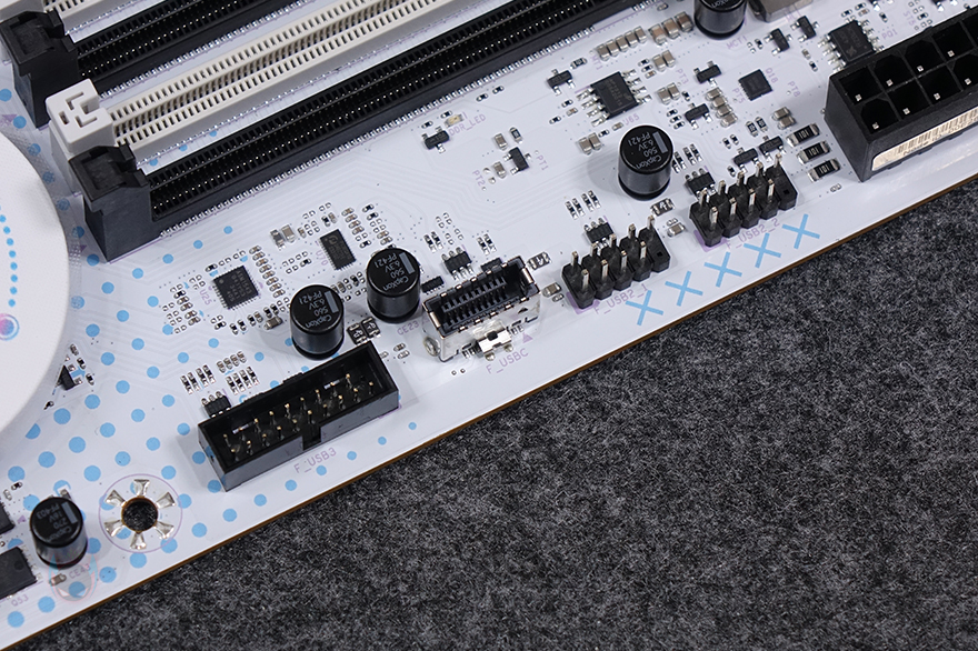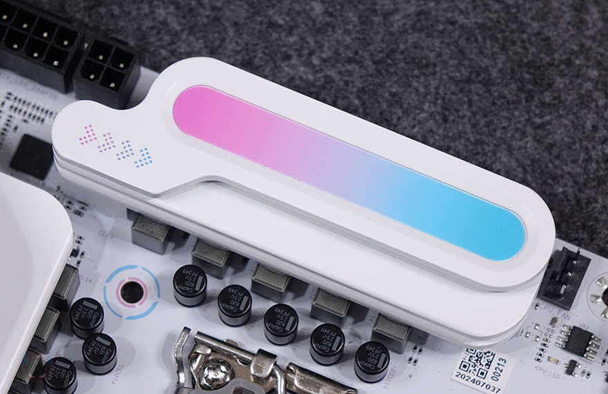 메모리 슬롯(RAM Slot)은 총 4개 구성으로 DDR5를 지원하며, 최대 192GB 용량까지 지원하며, 논바이너리 용량인 24GB, 48GB도 지원합니다. 클럭은 CPU에 따라서 7600MHz이상도 지원하죠. 개봉 시에는 역시 스티커가 부착되어 있어서 제거를 해줘야 합니다. 그리고, 슬롯 주변에는 5V ARGB 헤더 2개와 12V RGB 1개가 배치된 것을 확인할 수 있으며, 슬롯 앞부분에는 USB 2.0 내부 헤더 2개와 USB 3.2 Gen1 내부 헤더와 USB 3.2 Gen1 Type-C 내부 헤더가 배치되어 있죠. 그리고, 같은 위치에서 맨 아래 그러니깐 메인보드 맨 오른쪽 아래 구석에는 온보드 버튼(Onboard button)도 적용되어 있는데, 전원 버튼, RGB 버튼입니다.