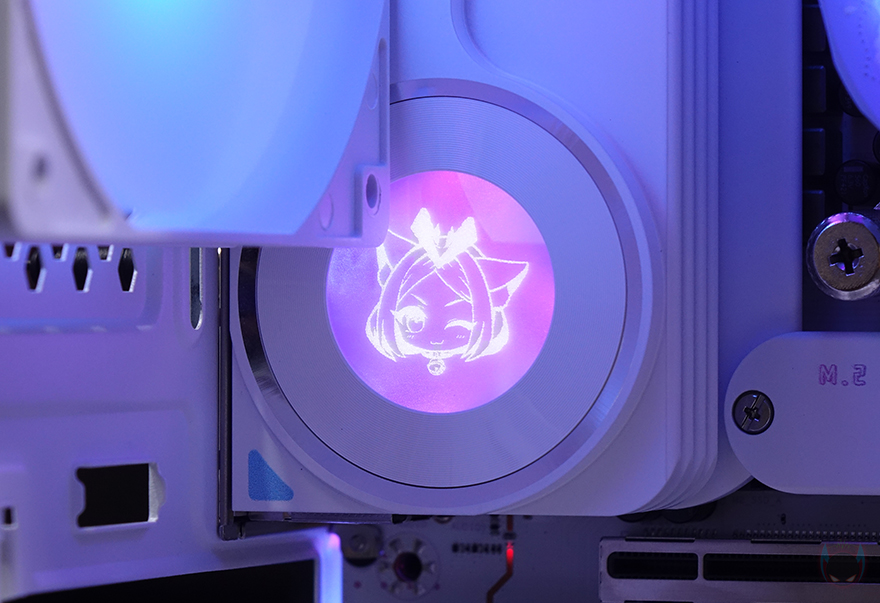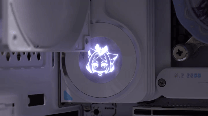 직접, MAXSUN(맥선) iCraft B760M CROSS 메인보드를 사용해보면, 일단 5V와 12V RGB 헤더를 갖추고 있기 때문에 주변 부품들이 RGB Sync를 지원하면, MAXSUN의 RGB Sync와 연동해 사용할 수 있습니다. 그리고, 앞서 확인한 전원부 히트싱크 부분에는 전원이 켜지면 디스플레이 부분에 캐릭터가 나타나고, 캐릭터 배경으로도 RGB 라이트 효과가 적용되는 것을 확인할 수 있습니다.
