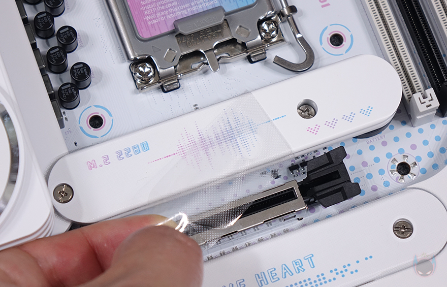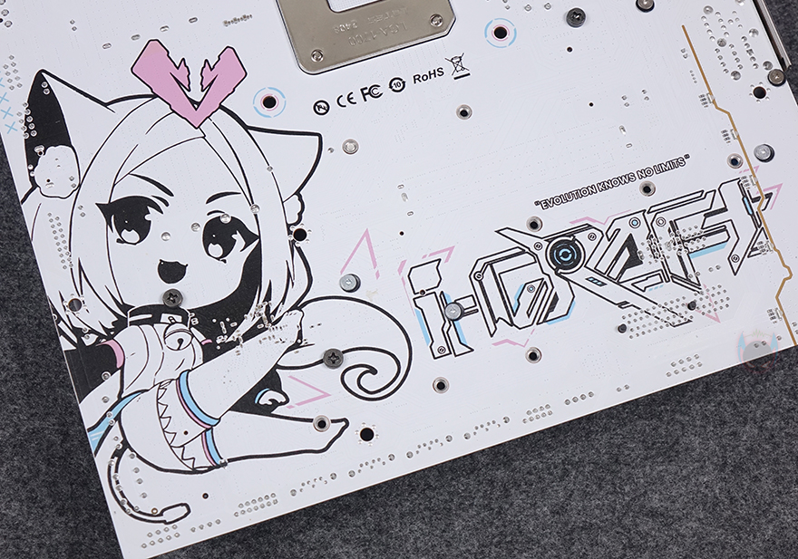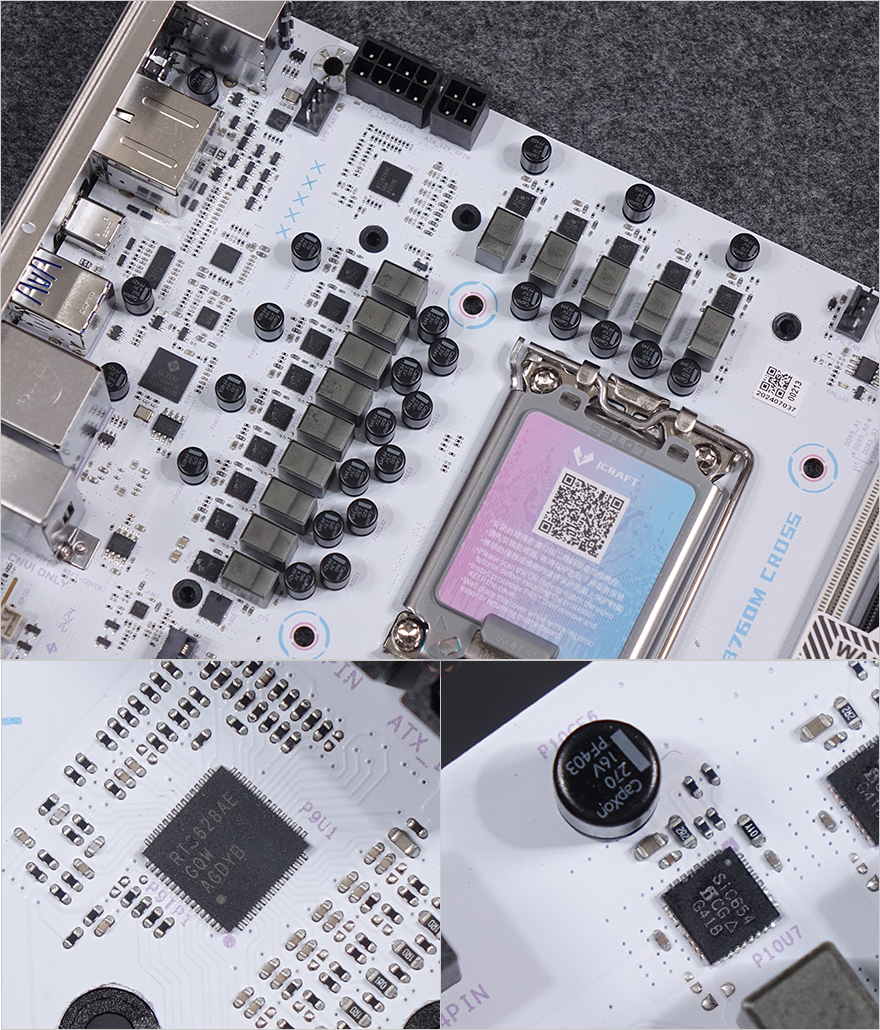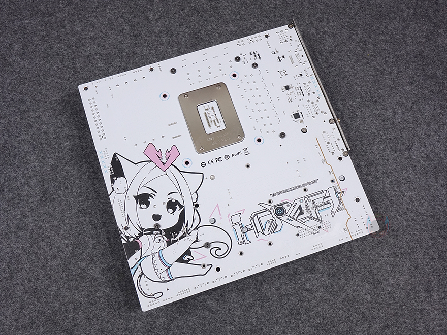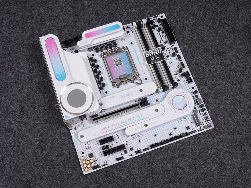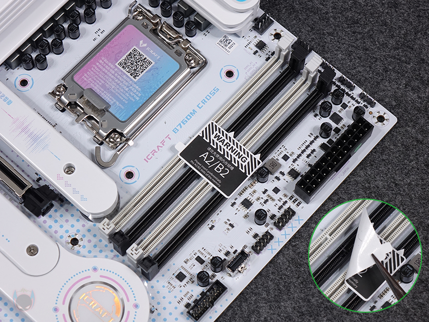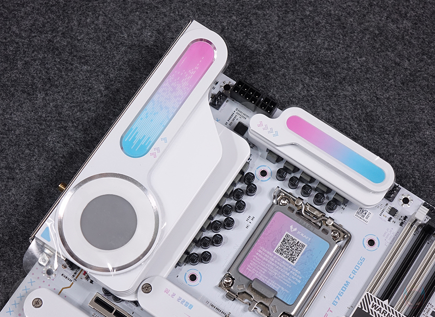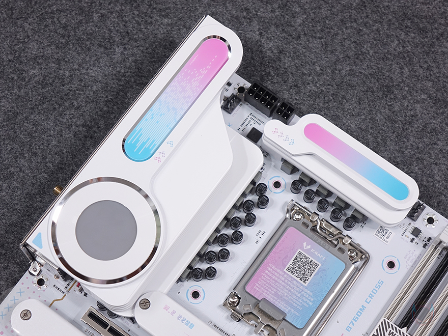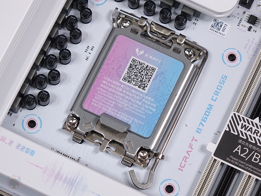 본격적으로 MAXSUN(맥선) iCraft B760M CROSS 메인보드 레이아웃을 살펴보면, 앞서 잠깐 언급듯이 메인보드 색상은 화이트(White) 콘셉트를 가지고 있습니다. PCB기판까지 화이트를 적용했는데, 후면에는 덕후 스타일(Geek style)답게 아이돌 캐릭터 디자인까지 적용되어 있죠. 그리고, CPU 소켓 커버 부분에도 컬러풀 색상을 적용했으며, QR코드로 적용하면 CPU 장착 영상을 참고할 수 있습니다.