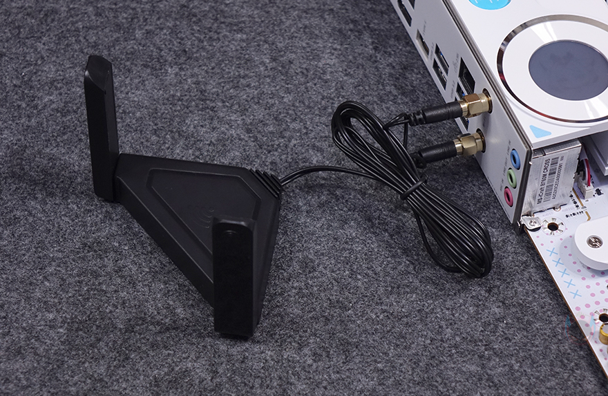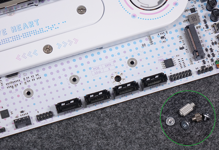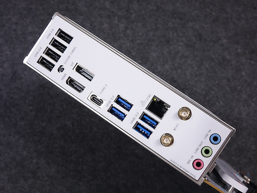 그리고, 아래에는 3번 M.2 SSD 슬롯이 배치되어 있는데, 2242/2280/22110 길이까지 장착할 수 있으며, 2번과 3번 M.2 SSD 슬롯에 NVMe SSD를 장착할 때는 제공되는 볼트와 나사를 사용하면 됩니다. 참고로, M.2 SSD 슬롯 규격은 모두 PCIe 4.0x4까지 지원합니다. 또한, 슬롯 아래에는 SATA 커넥터 4개가 배치되어 있으며, 메인보드 맨 왼쪽에는 내장 오디오 위치로 독립 PCB 구간으로 처리했으며, 오디오 칩셋은 리얼텍(Realtek)사 제품을 사용했고, 바로 옆에 추가 5V ARGB 헤더를 하나 더 확인할 수 있습니다. 끝으로, 백패널 I/O 부분에는 기본 실드가 장착되어 있으며, 포트 구성에는 위에서부터 USB 2.0(1.1) 포트 4개, CMOS 클리어(Clear) 버튼, 모니터 출력포트에 DP와 HDMI 포트, USB 3.2 Gen2x2 Type-C 포트 1개, USB 3.2 Gen1 포트 4개, 2.5G 랜 포트, Wi-Fi 안테나 커넥터, 오디오 잭(Jack) 포트가 적용되어 있습니다. Wi-Fi는 Wi-Fi 6E를 지원하며, 기본제공되는 Wi-Fi 안테나는 순서에 따라 안테나를 펼쳐서 연결 사용하면 됩니다.