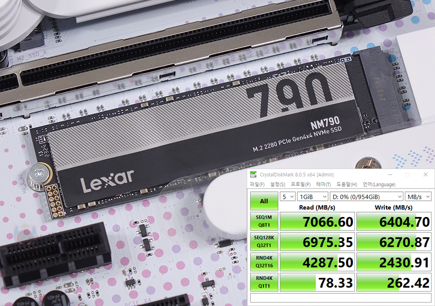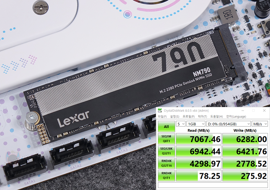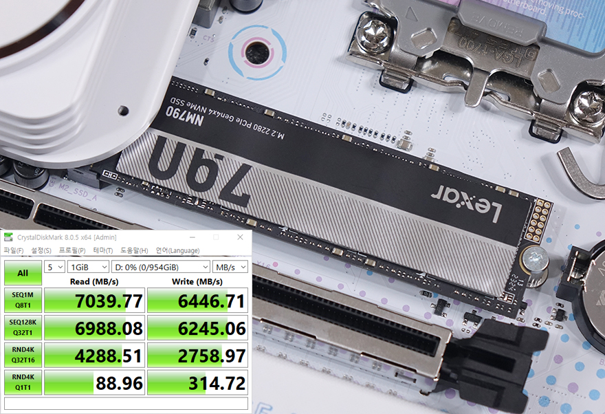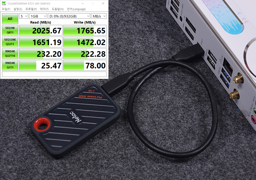 끝으로, 저장장치 지원 성능에 대해서 확인해보면, iCraft B760M CROSS 메인보드는 총 3개의 M.2 SSD 슬롯을 가지고 있는 것을 앞서 확인했으며, 모두 PCIe 4.0x4 규격을 지원한다고 언급했습니다. 실제 PCIe 4.0x4 규격의 NVMe SSD를 장착해서 읽기와 쓰기 속도를 확인해 보면, 규격상 최대 속도인 읽기 7000MB/s대와 쓰기 6000MB/s대 속도가 나오는 걸 확인할 수 있죠. 그리고, 백패널 I/O 포트 부분에는 USB 3.2 Gen2x2 규격의 Type-C 포트도 있는 걸 확인했는데, 실제 USB 3.2 Gen2x2 규격의 외장 SSD(External SSD)를 사용해 보면, 2000MB/s 근접의 속도로 나오는 걸 확인할 수 있습니다.