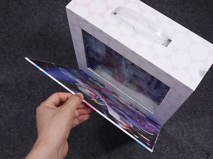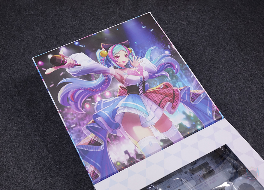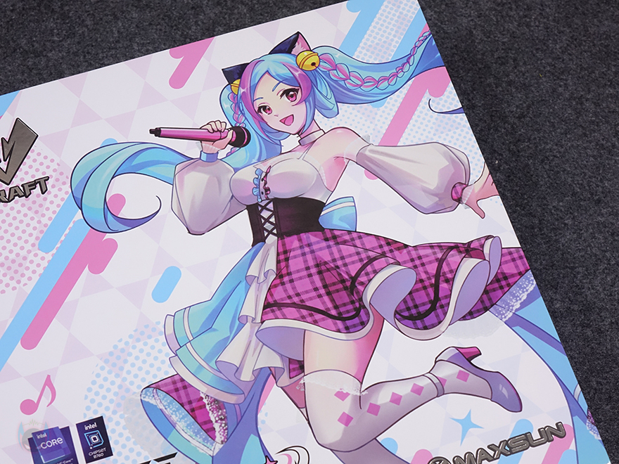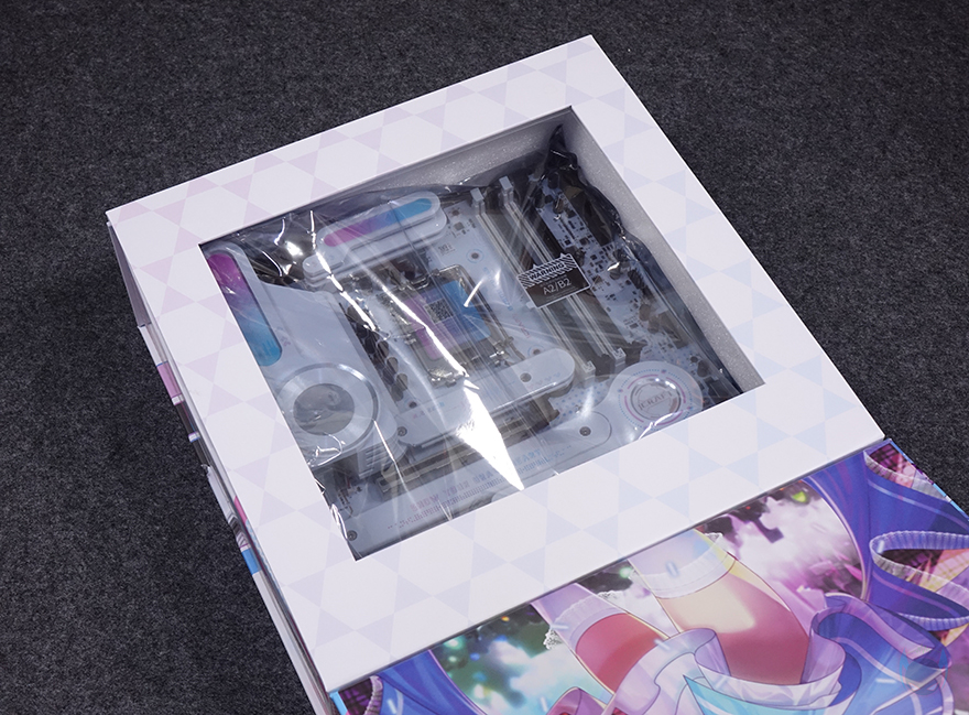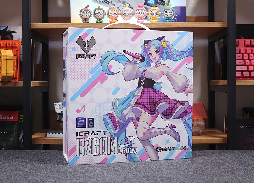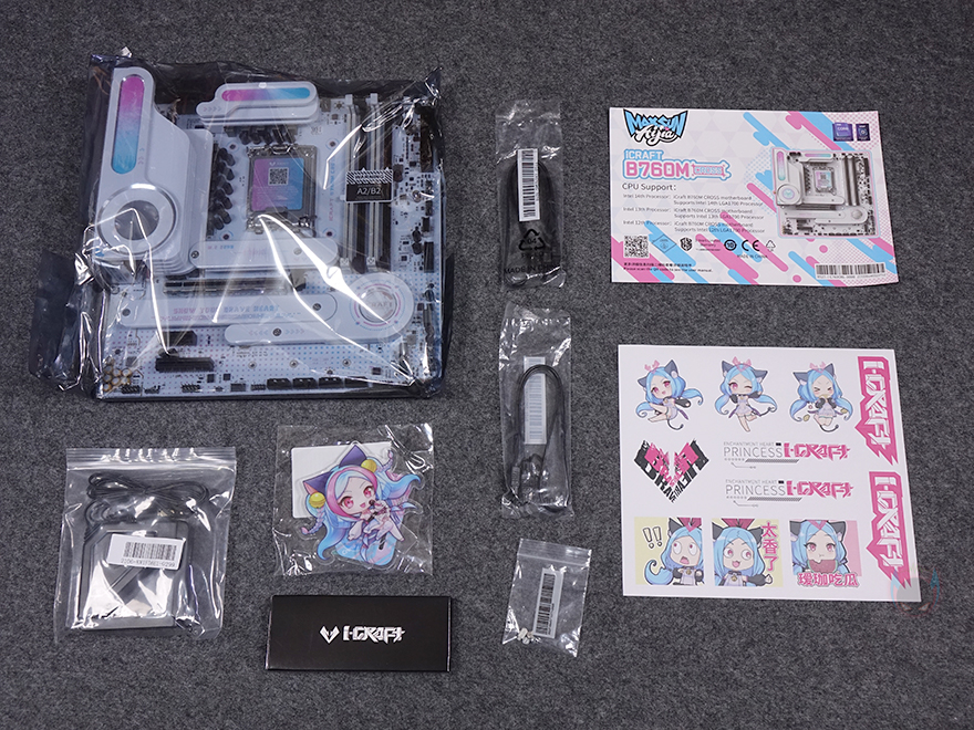 평범한 디자인의 제품은 아니기때문에 패키지에서부터 신경을 써서 이동식 손잡이까지 적용이 되어 있으며, 전면은 도어 커버 방식으로 적용해 박스를 개봉하지 않고도 내부에 포장된 iCraft B760M CROSS 메인보드를 확인할 수 있죠. 물론, 커버 안쪽에는 다시 한번 아이돌 캐릭터 디자인을 확인할 수 있습니다. 제품 구성품들은 모두 각 비닐 포장으로 처리되어 있으며, iCraft B760M CROSS 메인보드, SATA 케이블 2개, Wi-Fi 안테나, SSD 나사 기본 구성외에도 제품 콘셉트에 맞춘 캐릭터 디자인 스티커, 캐릭터 스탠딩 간판, 그리고 공구 드라이버도 제공을 해주고 있죠.