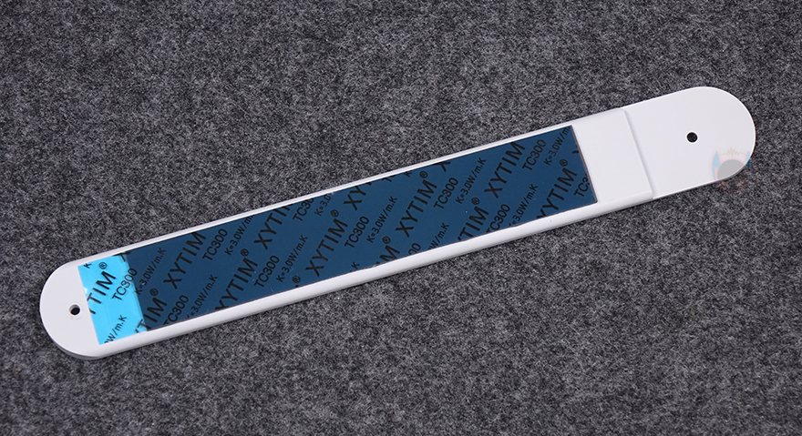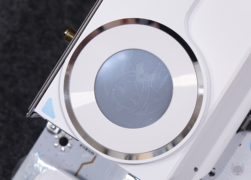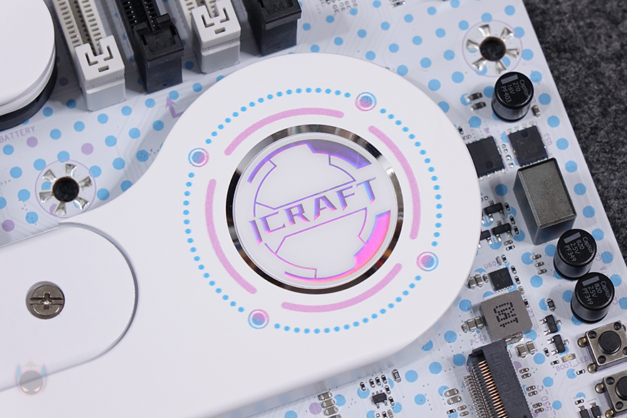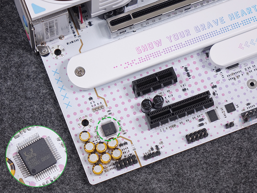 CPU 주변 전원부에는 발열해결을 위해 방열판(Heatsink)이 기본 장착되어 있으며, 개봉시에는 보호비닐이 부착되어 있습니다. 방열판 역시 화이트 색상을 베이스로 적용했으며, 한쪽에는 거울 같은 동그란 디자인을 확인할 수 있는데, 뒤에서 확인하겠지만, 작동 시 캐릭터 영상이 나오는 디스플레이죠. 방열판을 분리하면 안쪽에는 모스펫과 초크 부분에 발열을 해결할 수 있게 기본 써멀패드(Thermalpad)가 부착되어 있으며, 방금 언급했던 캐릭터 영상 디스플레이 장치도 확인할 수 있습니다. 전원부는 12+1+1 페이즈(Phase) 구성으로 총 14-페이즈이며, 전원부 컨트롤러(PWM) 칩셋은 Richtek사 칩셋이 적용되었고, Dr.MOS는 Vishay사 칩셋이 적용되었으며, 캡패시터는 Capxon사 제품이 사용되었습니다. 참고로, MAXSUN은 경쟁사들처럼 전원부 칩셋에 대해서 꺼려하지 않고, 투명하게 공개하는 걸로도 유명하죠. 그리고, CPU 보조전원(EPS)은 8핀과 4핀으로 적용되어 있습니다.