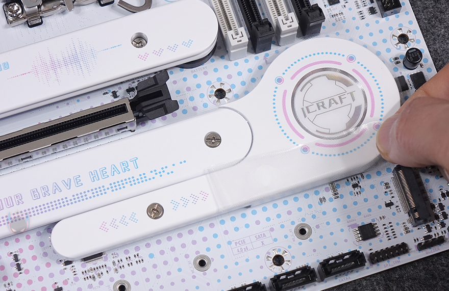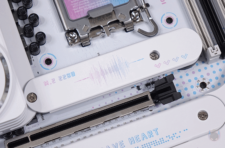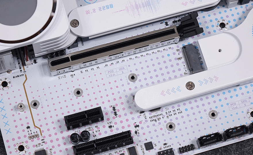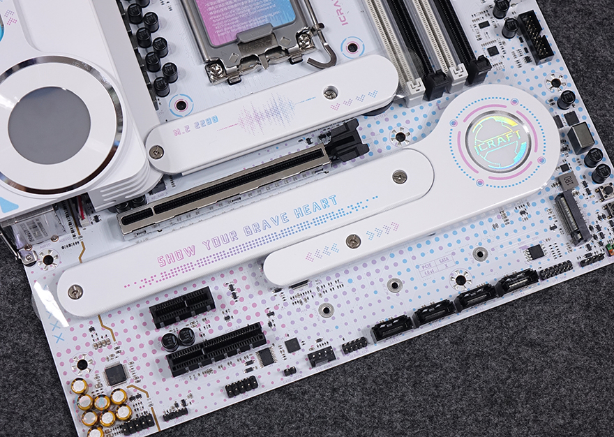 PCIe 슬롯은 총 3개를 구성하고 있으며, 그래픽카드가 장착되는 1번 슬롯은 PCIe 5.0x16 배속 지원이며, 나머지 2개의 슬롯은 모두 PCIe 3.0 슬롯입니다. 그리고, 1번 슬롯 바로 위에는 1번 M.2 SSD 슬롯이 배치되어 있는데, 발열해결을 위해 방열판(Heatsink)이 장착되어 있으며, 역시 개봉 시에는 보호비닐이 부착되어 있습니다. 방열판은 분리 하면 내부에 2242/2280 사이즈 길이 지원을 확인할 수 있으며, 방열판 안쪽에는 기본 써멀패드가 부착되어 있죠. 또한, 1번 슬롯 아래에도 2번 M.2 SSD 슬롯이 있는데, 역시 방열판과 함께 개봉 시 보호비닐이 부착되어 있고, 분리하면 2242/2280/22110 사이즈 즈 길이 지원을 확인할 수 있습니다. 그리고, 그 옆에는 인텔 B760 메인 칩셋 자리로 역시 방열판이 부착되어 있으며, 개봉 시에는 보호비닐을 제거해야 합니다. 칩셋이 위치한 부분에는 iCarft 로고(logo)를 새겨놨죠.