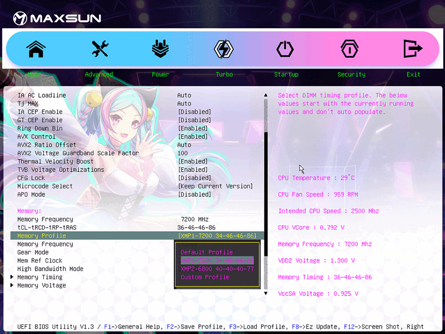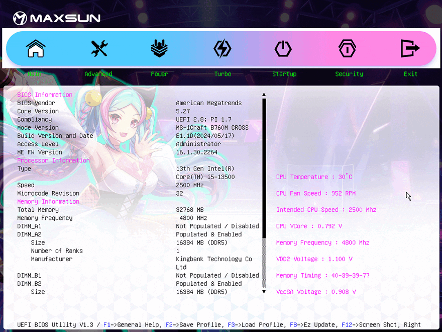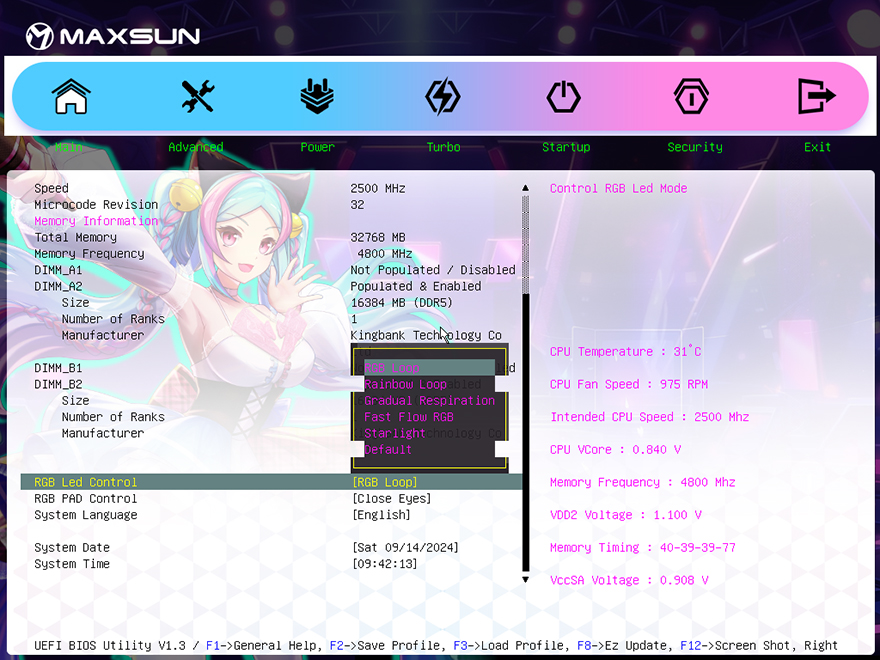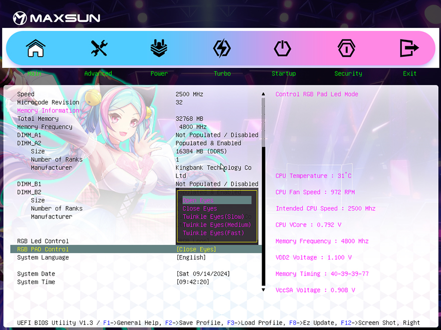 각 부품별 지원 성능을 확인해보기 전에 iCraft B760M CROSS 메인보드의 바이오스(BIOS) CMOS를 잠깐 살펴보면, 제품 콘셉트에 맞게 CMOS 인터페이스 디자인(Interface design)도 아이돌 캐릭터를 배경으로 적용하고 있습니다. 메뉴는 크게 메인(Main), 고급(Advanced), 파워(Power), 터보(Turbo), 부팅(Startup), 보안(Security), 종료(Exit) 7가지이며, 메인에서 일부 RGB 모드와 캐릭터 디스플레이 표정을 변경할 수 있게 지원하고 있죠. 쉽게 말해, 운영체제 안에서 사용하는 소프트웨어 없이도 일부 RGB 라이트효과 모드를 변경할 수 있습니다. RGB 모드는 총 6가지며, 캐릭터 표정은 크게 3가지로 윙크 표정이 기준이라고 보면 됩니다.