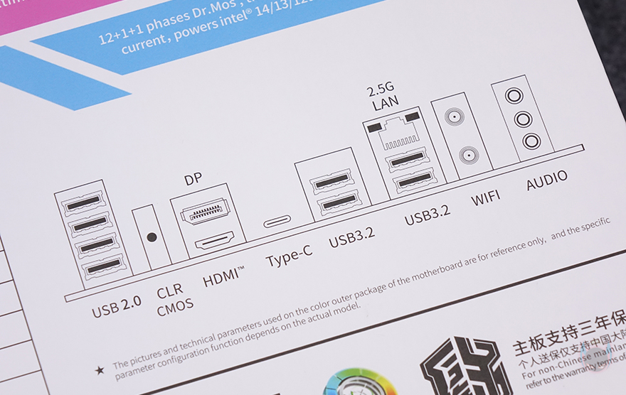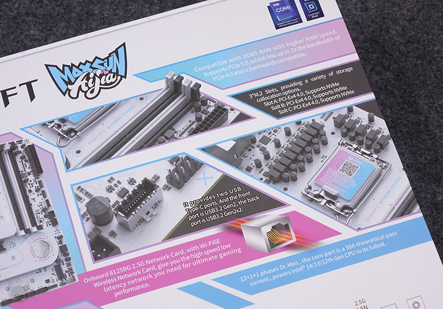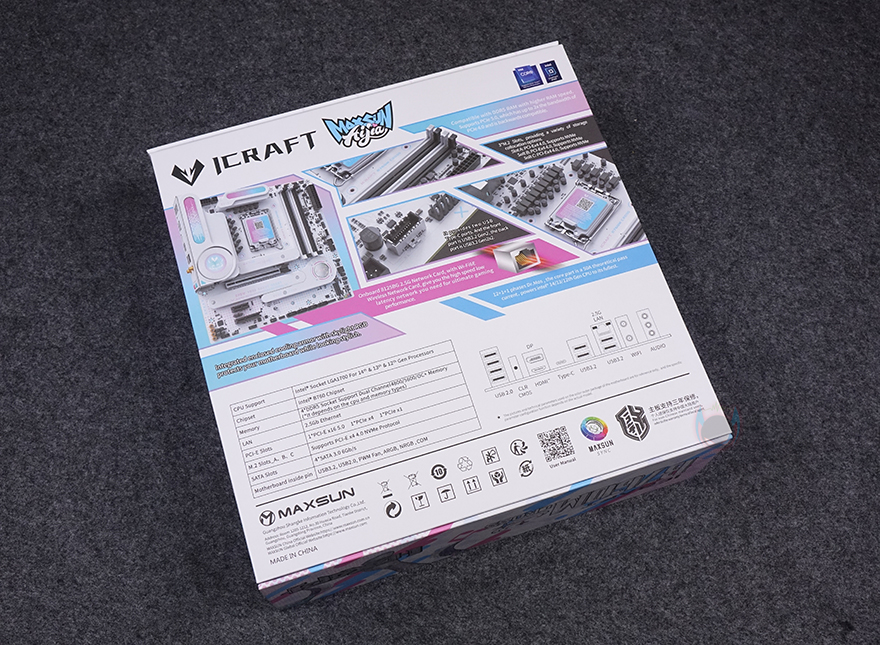 iCraft B760M CROSS 메인보드는 제품 박스에서부터 특별함이 느껴집니다. 한눈에 봐도 평범한 디자인은 아니라는거죠. 박스 전면에는 아이돌 캐릭터 디자인(Idol character design)을 삽입했으며, 인텔(Intel) B760 칩셋과 모델명을 확인할 수 있죠. 그리고, MAXSUN의 게이밍 라인업인 iCraft 표기도 확인할 수 있습니다. 물론, 박스 배경이 화이트 계열이라 이 제품이 화이트 메인보드라는 것도 쉽게 짐작할 수 있습니다. 그리고, 박스 후면에서 바로 제품 풀샷 이미지를 확인할 수 있고, 바로 옆에 주요 특징으로 DDR5 지원과 3개의 M.2 SSD 슬롯 지원, USB 3.2 Gen2 지원, 2.5G 랜과 Wi-Fi 6 지원, 전원부 언급을 하고 있죠. 또한, 아래에는 백패널 I/O 포트 구성도 표기해 놨으며, 그 옆에 제품의 기본 사양 표기도 상세하게 담고 있습니다.