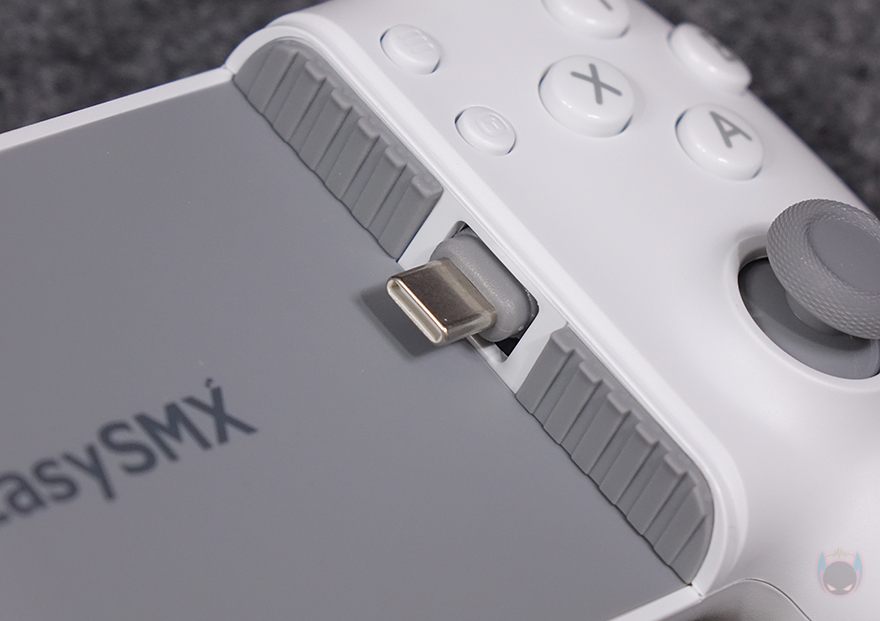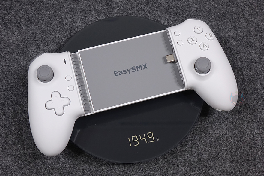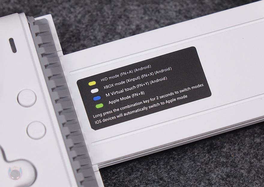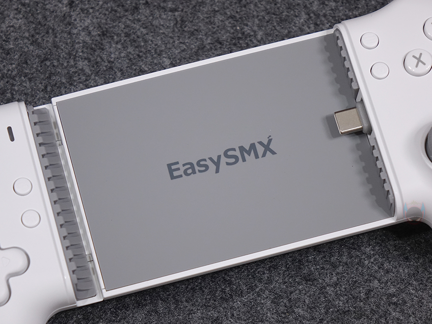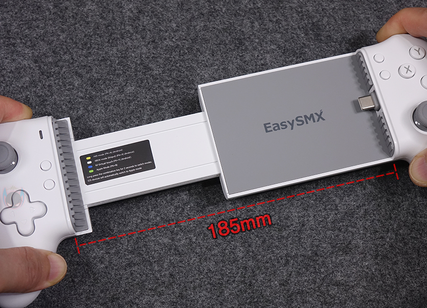 그럼, 본격적으로 EasySMX M15 모바일 게임패드(Mobile Gaming Controller)를 살펴보는데, 색상은 밝은 그레이 계열로 한가지 색상으로만 출시되었으며, 무게는 약 195g으로 모바일 게임패드에선 가벼운 편에 속합니다. 스마트폰 무게와 비슷하기 때문에 휴대성에는 문제가 없다는 거죠. 그리고, 스마트폰이 장착되는 중앙 부분에는 EasySMX 로고(logo)를 새겨놨으며, 표면에 패드(Pad)를 부착해 미끄럼방지가 되도록 했습니다. 오른쪽에는 스마트폰과 연결되는 USB Type-C 인터페이스가 배치되어 있는데, 안쪽에 고무재질로 마감해 위아래로 유연성을 가지고 있습니다. 스마트폰 장착은 다른 모바일 게임패드와 마찬가지로 기본 방식인 패드를 양쪽으로 당기면 중앙이 늘어나는 방식으로 최대 185mm까지 늘어나며, 사실상 폴더 스마트폰을 제외하고 바(Bar) 형태의 스마트폰은 모두 장착된다고 보면 됩니다. 참고로 제조사에서 권장하는 장착 갈이는 176mm입니다. 그리고, 패드를 양쪽으로 당겼을 때, 안쪽 왼쪽에는 4가지 연결모드(HID, XBOX, M Virtual touch, Apple) 사용법에 대한 표기를 확인할 수 있죠.