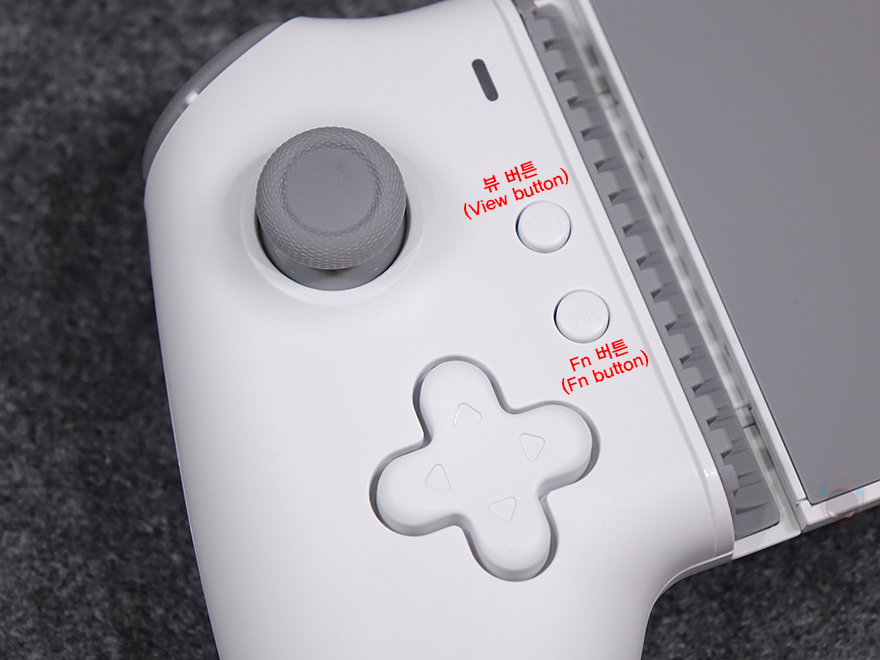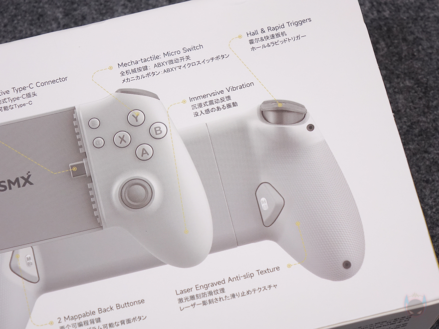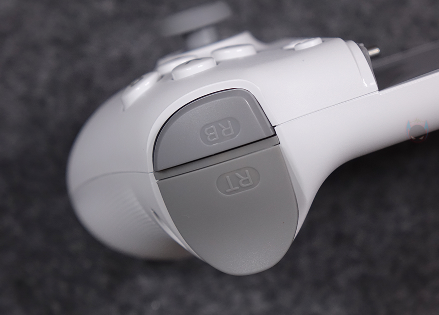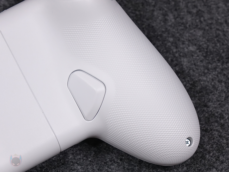 패드 양쪽 그립부분은 Xbox 패드형태를 기본 베이스로 하고 있는데, 왼쪽 그립 부분에는 조이스틱(Joystick)과 D패드(D-pad)가 배치되어 있으며, 바로 오른쪽에는 작동 상태를 확인할 수 있는 LED 인디케이터와 뷰(View) 버튼, Fn 버튼이 배치되어 있습니다. 그리고, 오른쪽 그립 부분에는 ABXY 버튼과 조이스틱이 배치되어 있으며, 메뉴(Menu) 버튼과 홈/터보(Home/Turbo) 버튼이 배치되어 있죠. 조이스틱은 요즘 트렌드에 맞춰서 홀-이펙트(Hall-effect) 센서 방식을 적용했으며, D-패드와 ABXY 버튼은 마우스 버튼에 사용되는 택타일 스위치(Tactile switch)를 사용했습니다. Xbox 패드형태를 기본 베이스를 가졌기 때문에 양쪽 패드 전면에는 트리거(Trigger)와 LB/RB 버튼도 배치되어 있죠. 참고로 트리거 버튼 역시 홀-이펙트 센서 방식을 적용했습니다. 그리고, 패드 후면에는 그립시 중지 손가락 위치에 딱 맞게 맵핑(Mapping) 버튼 2개가 배치되어 있으며, 그립 부분에 엠보싱 디자인을 적용해 그립감을 높이도록 했습니다.