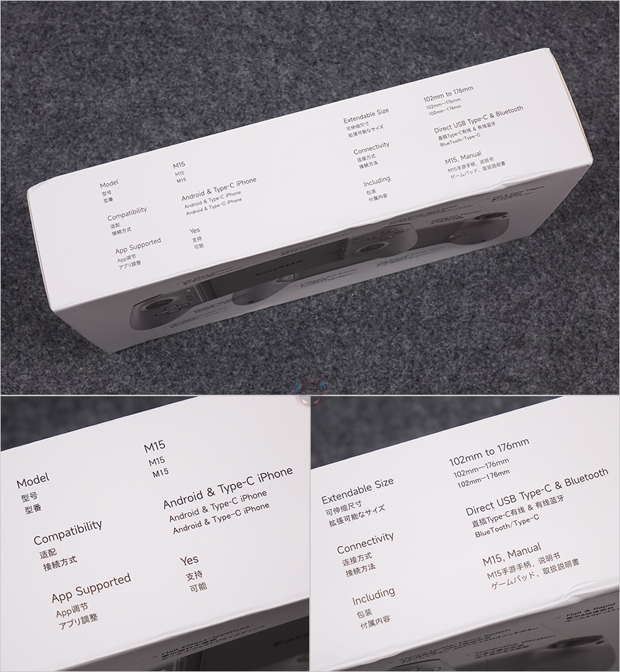 박스 측면에는 제품의 기본 사양을 표기해놨는데, 디바이스 플랫폼과 앱 지원, 사이즈, 인터페이스, 구성품 목록을 확인할 수 있으며, 박스 후면에는 제품 앞뒤 이미지와 함께 부위별 명칭을 상세하게 표기해 놨습니다. 제품 박스를 열어보면, 제품 포장은 제품 틀에 맞춘 포장재를 사용해 흔들리지 않도록 했으며, 제품 구성에는 M15 모바일 게임패드, 제품 설명서로 간단합니다.