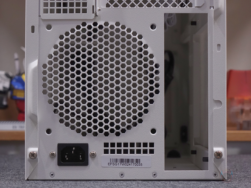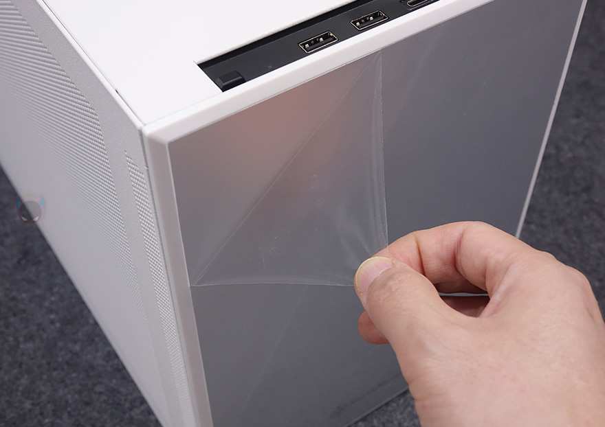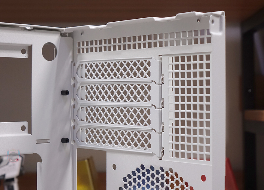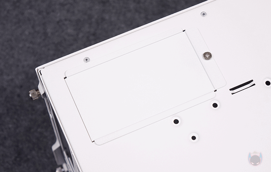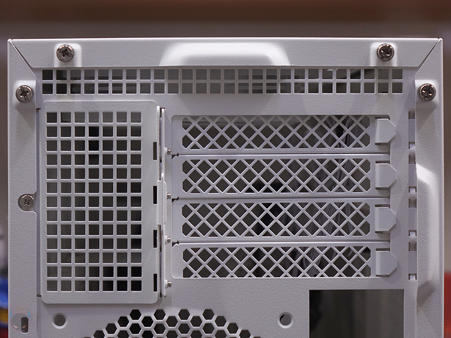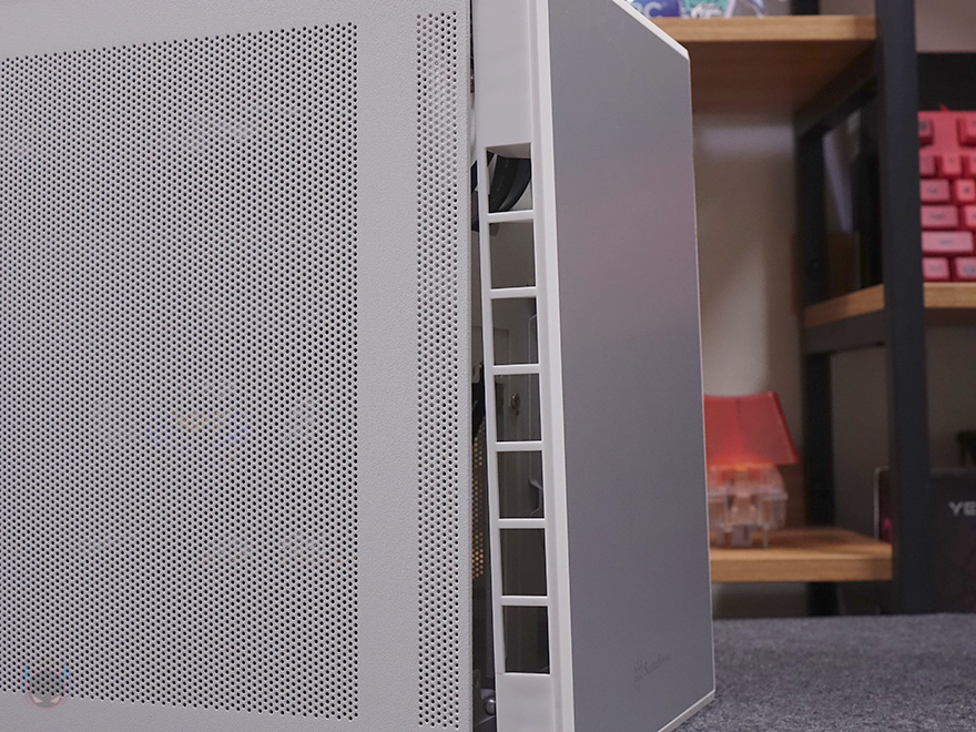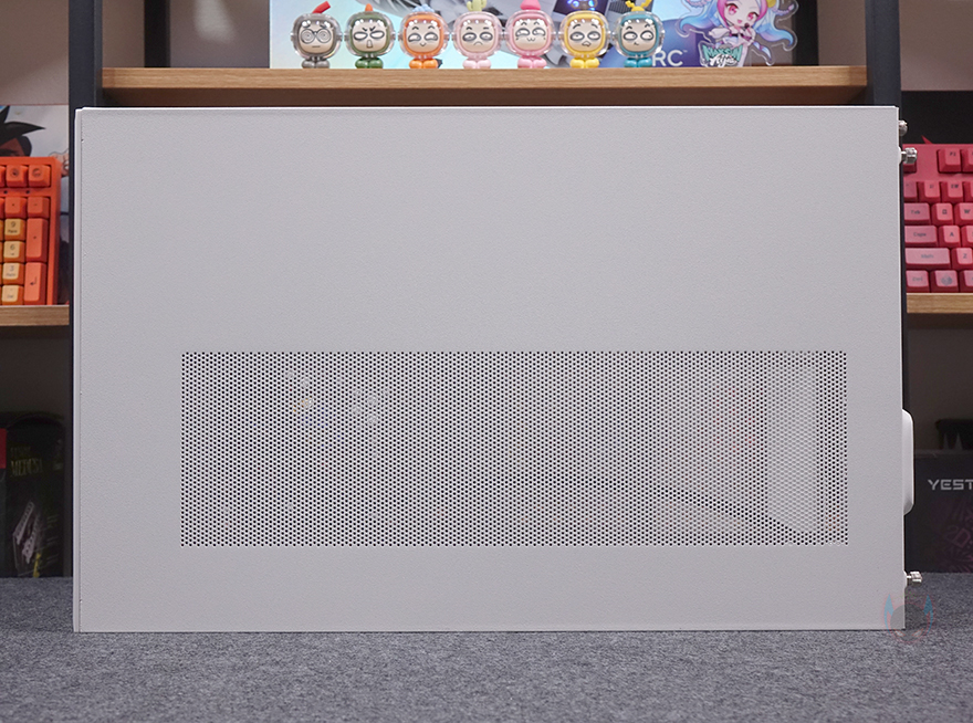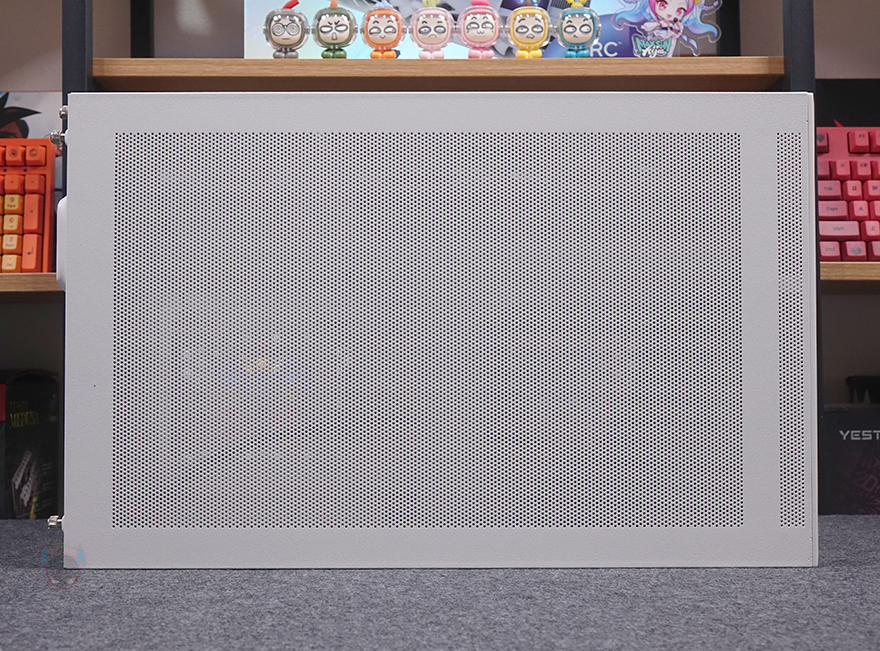 사이드 패널 역시 양쪽 모두 상단 패널처럼 촘촘한 메쉬 에어홀 디자인을 적용했는데, 전면 기준 오른쪽 패널은 아랫부분에, 왼쪽 패널은 전체 면적에 디자인을 적용했습니다. 이렇게 서로 면적이 다르게 적용한 이유는 뒤에 내부 구조에서 쉽게 이해할 수 있습니다. 참고로, 사이드 패널 역시 후면에 손나사로 고정되어 있습니다. 그리고, 촘촘한 구멍을 가졌기 때문에 따로 먼지 필터는 적용되어 있지 않습니다.