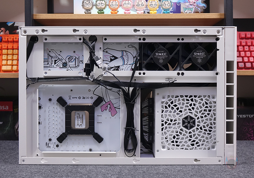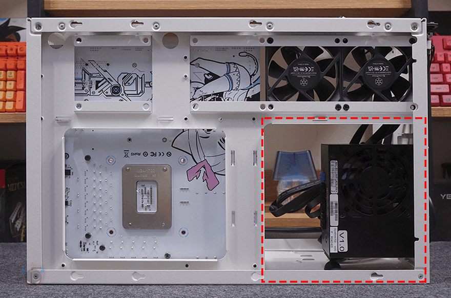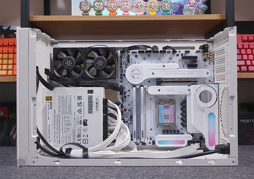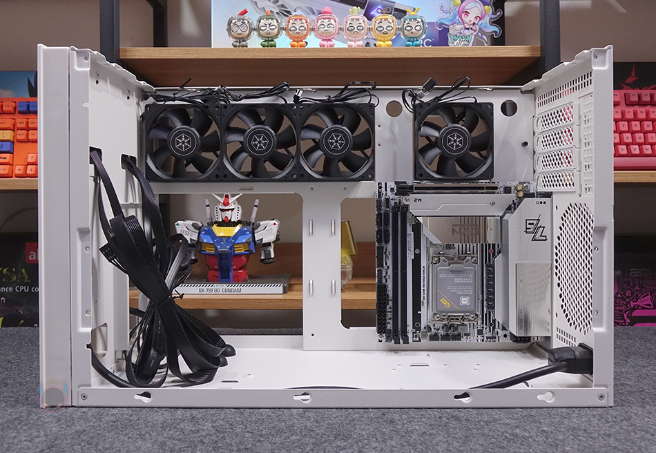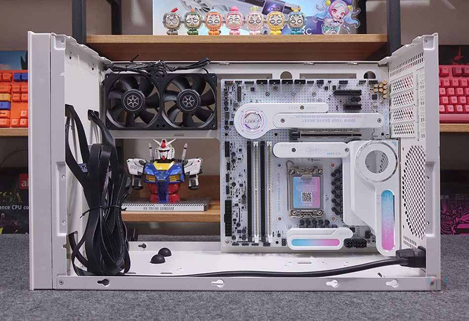 직접, 실버스톤(Silverstone) SUGO 17 PC케이스를 사용해 시스템 조립을 해보면, 일단 앞서 언급했듯이 메인보드는 Mini-ITX와 M-ATX 모두 장착이 가능하고, Mini-ITX를 장착했을 때 측면 80mm 팬은 최대 4개까지 장착이 가능하고, M-ATX를 장착했을 때는 2개까지 장착이 가능합니다. 그리고, 메인보드 왼쪽 자리에 위치하는 파워서플라이 역시 전면 내부에서 언급했듯이 브래킷을 사용하면 SFX/SFX-L 규격을 장착할 수 있고, 브래킷을 제거하면 ATX 규격의 파워서플라이를 장착할 수 있죠. 그리고, 앞서 언급했듯이 메인보드 보조전원 케이블 연결은 하단에 적용된 커버를 분리하면 어렵지 않게 연결할 수 있습니다.