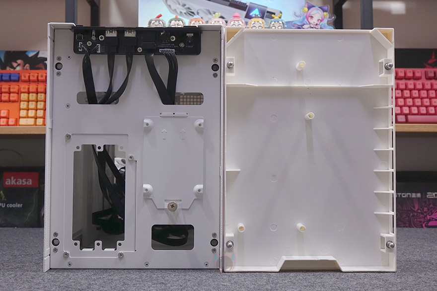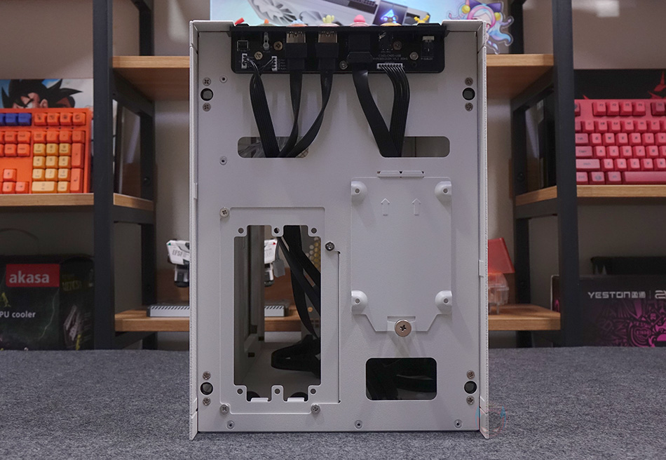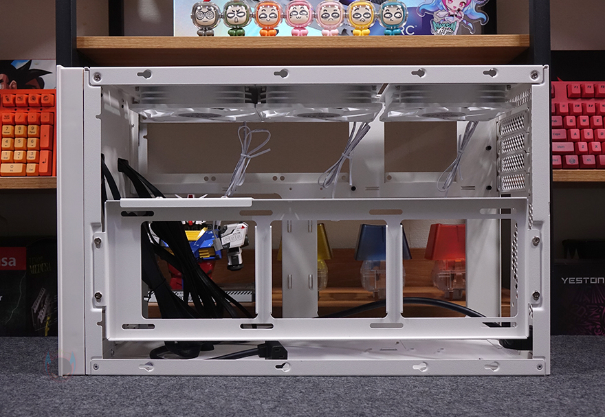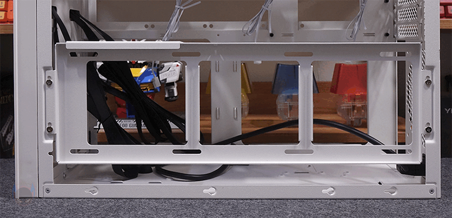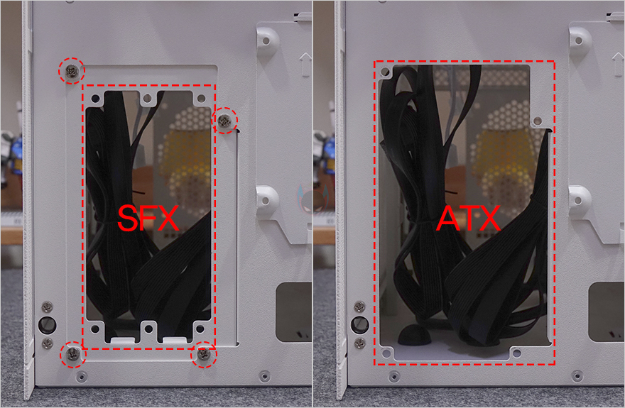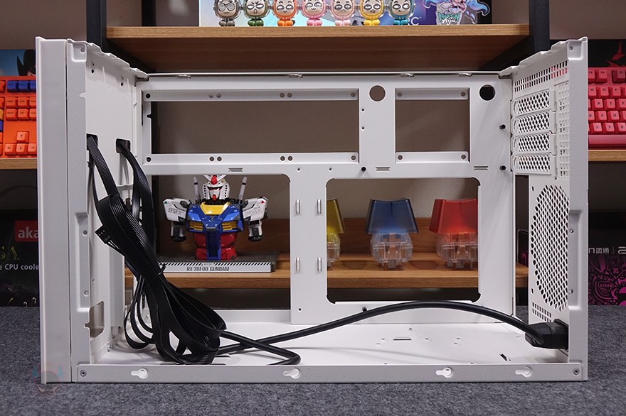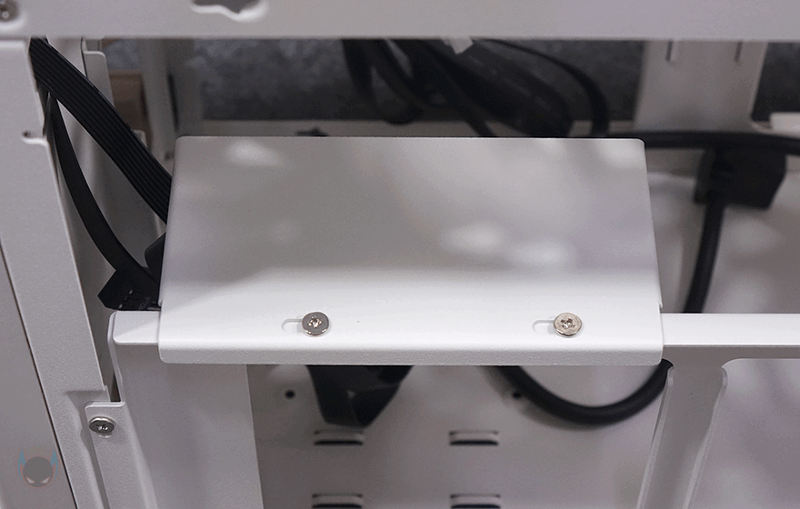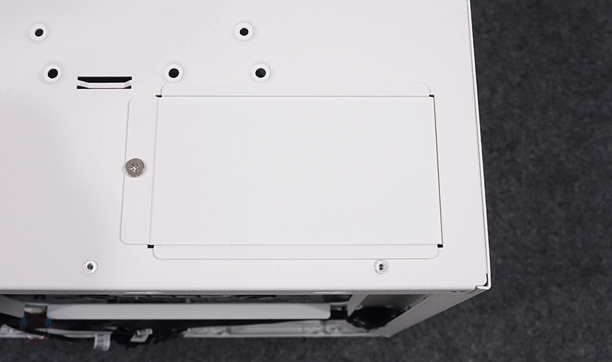 그리고, 전면 베젤은 하단 손잡이를 통해 앞으로 당기면 분리할 수 있으며, 전면 기준 베젤 왼쪽 측면에는 사이드 패널과 겹치 부분으로 베젤 측면 공기 유입을 위해 에어홀 처리를 해놨습니다. 전면 베젤을 분리해, 전면 내부를 미리 살펴보면, SUGO 17은 큐브 형태를 가졌기 때문에 일반적인 미니타워 구조와는 다릅니다. 그래서, 전면 내부에서 파워서플라이와 저장장치가 각각 장착이 되는 구조를 가졌죠. 오른쪽에는 2.5인치 HDD/SSD 1개를 장착할 수 있는 브래킷이 장착되어 있으며, 왼쪽에는 파워서플라이 자리로 브래킷을 사용하면 SFX/SFX-L 규격을 장착할 수 있고, 브래킷을 제거하면 ATX 규격의 파워서플라이를 장착할 수 있습니다. 이 부분은 뒤에 조립 부분에서 다시 확인하겠습니다.