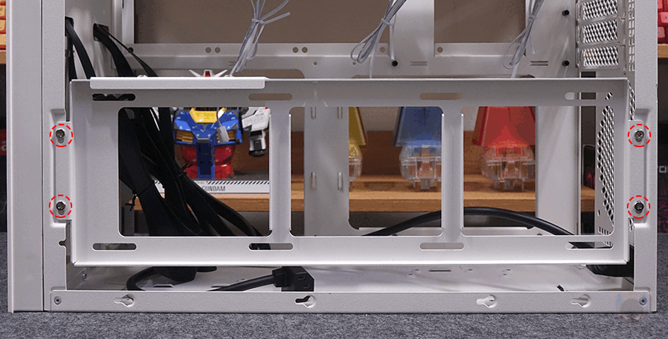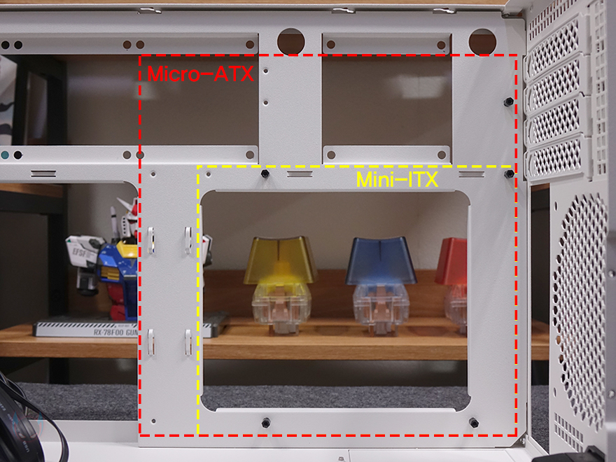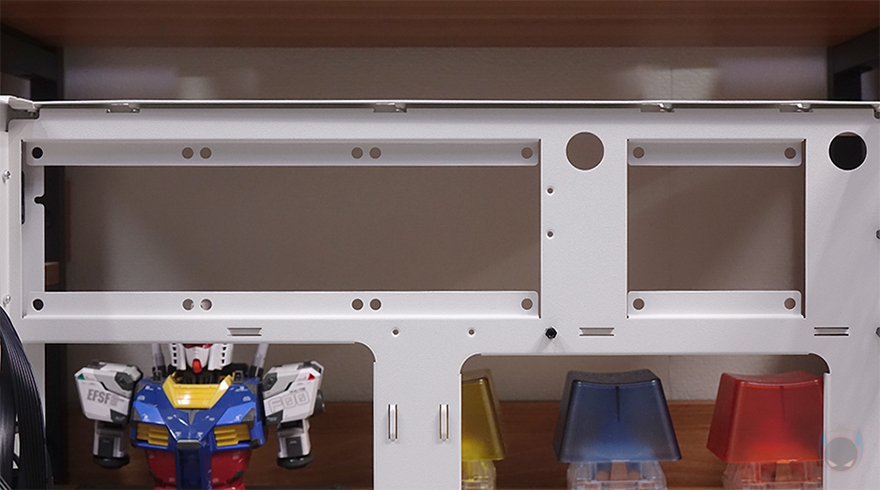 측면과 상단 브래킷까지 분리하고 나면, 내부 구조를 좀 더 쉽게 파악할 수 있는데, 앞서 외부 후면에서 언급했듯이 SUGO 17 내부 구조는 메인보드가 거꾸로 장착되는 리버스 구조를 가졌습니다. 메인보드는 Mini-ITX와 M-ATX 모두 장착이 가능하고, 후면 윗부분에 위치한 PCI 슬롯 가이드는 모두 재사용이 가능한 착탈식이죠. 참고로 메인보드를 받치는 Stand-off 나사는 기본 Mini-ITX 규격에 맞춰 장착되어 있으며, M-ATX 메인보드를 장착할 때는 제공되는 Stand-off 나사를 추가로 장착해야 합니다. 참고로, 메인보드와 같은 위치에 왼쪽 자리는 파워서플라이(PSU) 자리입니다.