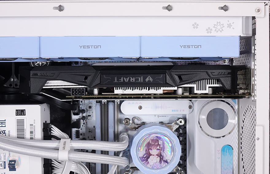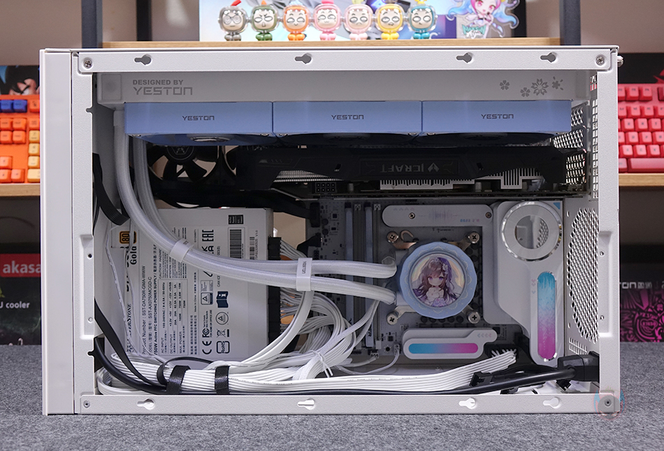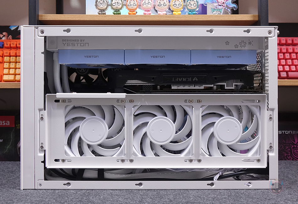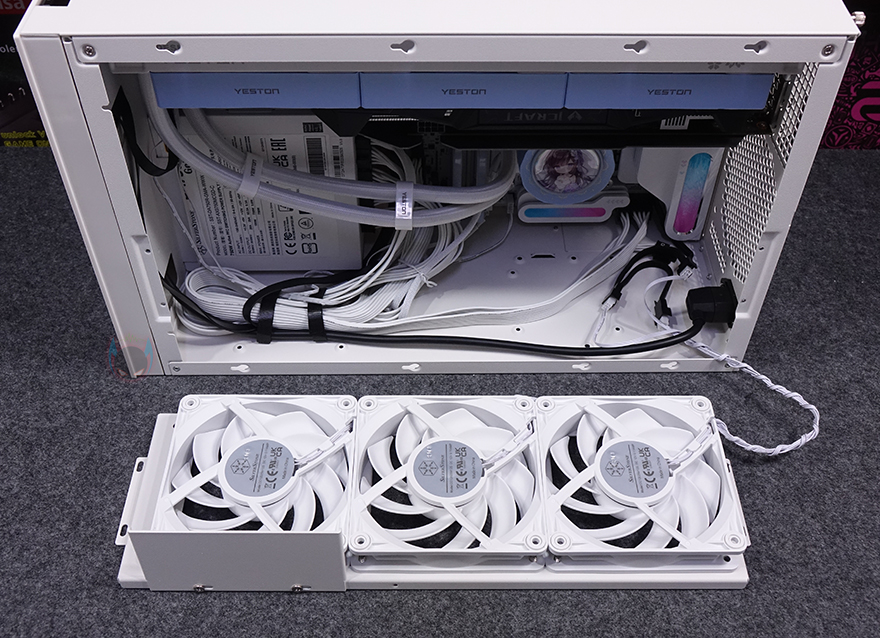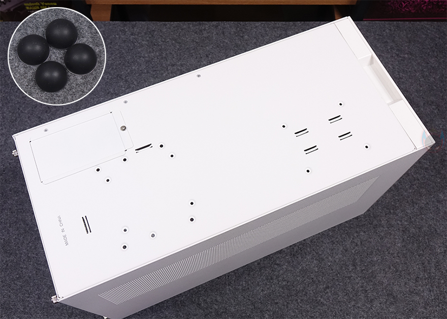 물론, 상단에 라디에이터를 장착하게 되면 윗공간에 장착되는 그래픽카드 역시 제한이 있을 수밖에 없는데, 2단 슬롯 높이의 그래픽카드까지는 장착을 하더라도 라디에이터 사이와 빈 공간이 생깁니다. 다시 말해, 2.5단이나 3단 높이의 그래픽카드를 장착한다면 라디에이터를 측면에 장착해야 한다는 거죠. 그래픽카드는 최대 400mm 길이까지 지원하기 때문에 시중에 판매되는 대부분의 그래픽카드는 장착이 됩니다. 그리고, 상단에 라디에이터를 장착하면 측면에 팬을 장착해 주면 되고, 그래픽카드 지지대는 제공되는 고무패드를 브래킷 받침대에 부착해서 사용하면 됩니다. 조립 시작 부분에서 언급했듯이 최대 범위 지원의 부품들로 장착하게 되면 협소나 제한적인 부분이 발생할 수 있기 때문에, 수월한 조립을 원한다면 Mini-ITX와 SFX/SFX-L 규격 그리고 공랭쿨러를 사용하는게 좋습니다. 조립 마무리로 앞서 언급했듯이 SUGO 17 PC케이스 밑바닥에는 기본 받침대가 적용되어 있기때문에 제공되는 부착형 고무 받침대를 부착시켜줘야 합니다.