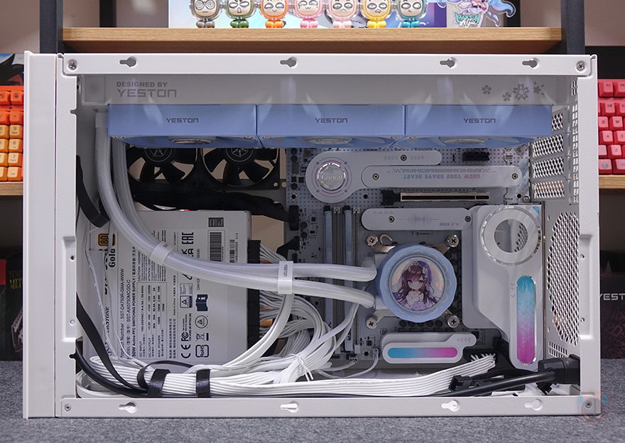 Mini-ITX 메인보드와 SFX/SFX-L 파워서플라이를 사용하면 비교적 내부 공간이 수월해져서 조립에 큰 어려움이 없습니다. 그래서, 리뷰에선 최대 범위라 할 수 있는 M-ATX 메인보드와 ATX 파워서플라이 장착 기준으로 조립을 해봤는데, CPU 쿨러 장착 시 공랭쿨러를 사용한다면 큰 어려움 없이 진행할 수 있고, 수랭쿨러를 사용한다면 최대 360mm 라디에이터 장착시 측면보다는 상단에 장착하는 게 수월합니다. 왜냐하면, 라디에이터에 팬까지 장착하면 보통 52mm 두께이상을 같은 측면 위치에 파워서플라이도 있기때문에 수랭쿨러의 튜브 공간이 매우 협소해질 수 있기때문입니다. 그래서, 360mm 라디에이터 수랭쿨러를 사용한다면, 상단에 기본 장착된 팬은 측면으로 위치 변경하고 상단자리에 라디에이터를 장착하는게 수월합니다.