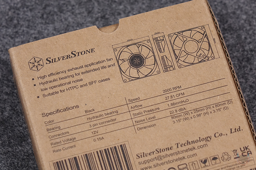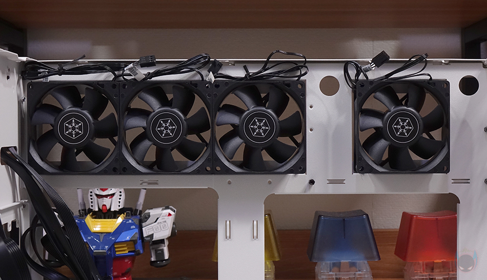 그리고, 그래픽카드(VGA)가 장착되는 윗공간 측면에는 측면 쿨링효과를 볼 수 있게 80mm 팬을 최대 4개까지 장착할 수 있게 지원하는데, 이를 지원하는 팬 역시 자사 제품 중에 있습니다. 바로, FN80(https://www.silverstonetek.com/en/product/info/fans/FN80/) 모델로 전형적인 80x80x25mm 규격을 가졌고, 블랙 색상에 3 pin 연결방식으로 최대 2000 RPM 속도로 작동합니다. 딱, HTPC와 SFF 케이스에 맞춘 고성능 소형팬이라고 보면 됩니다. 그래서, 이 FN80 팬을 SUGO 17 케이스 윗공간 측면에 최대 4개를 장착할 수 있는데, 뒤에 조리 부분에서 다시 확인하겠지만, 최대 4개 장착은 Mini-ITX 메인보드를 사용했을 때이고, M-ATX 메인보드를 장착하면 최대 2개까지 장착이 가능합니다.