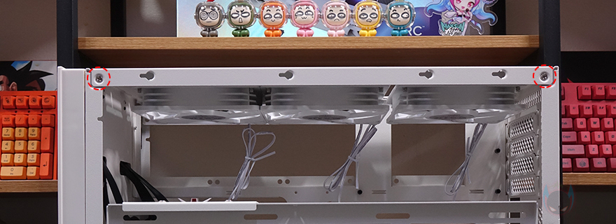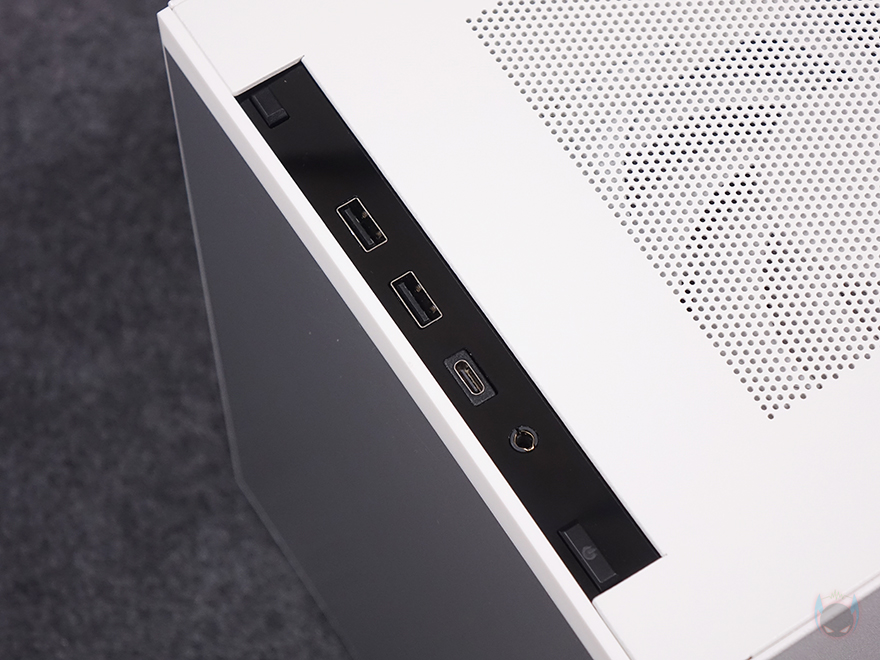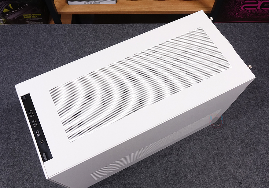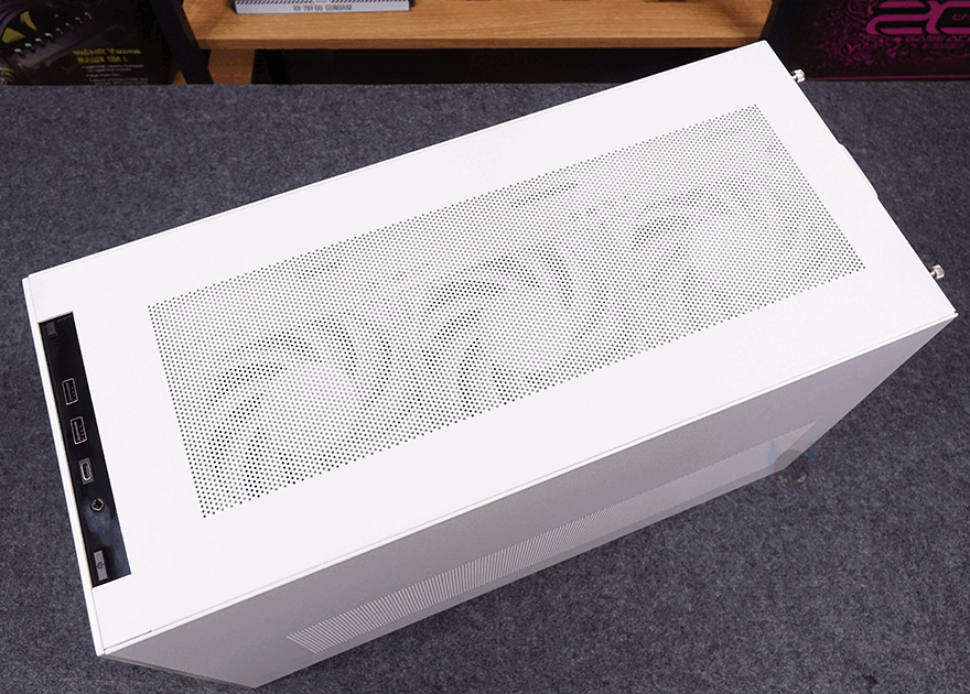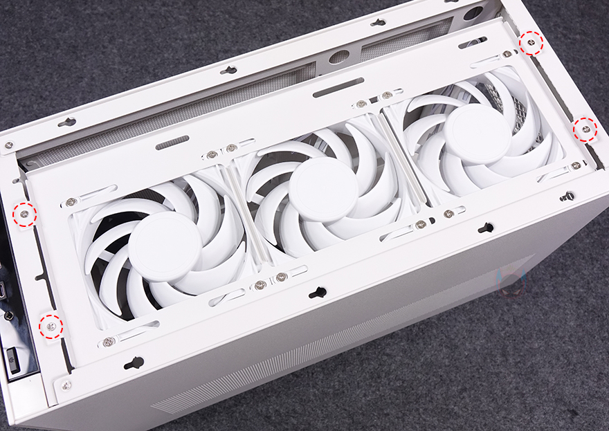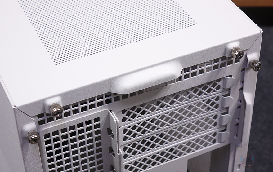 케이스 상단(Top)에는 중앙 부분에 촘촘한 메쉬 디자인 에어홀처리를 해놨으며, 맨 앞부분에는 버튼 및 포트 자리로 오른쪽부터 전원(Power) 버튼, 오디오/마이크 포트, USB Type-C, USB 3.0 포트 2개, 리셋 버튼이 배치되어 있죠. 그리고, 상단 패널은 후면에 손나사(Hand-screw)로 고정되어 있기때문에, 손나사를 풀면 쉽게 상단 패널을 분리할 수 있습니다. 상단 패널을 분리하면 내부에 120mm 팬이 기본 3개 장착된 것을 확인할 수 있죠. 뒤에서 다시 확인하겠지만, 이 팬은 조립 환경에 맞춰서 상단과 측면 두 곳 중에 장착할 수 있습니다. 그리고, 팬을 장착하고 있는 브래킷도 분리가 가능하죠.