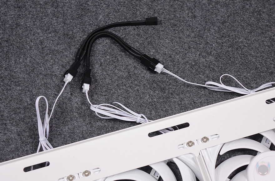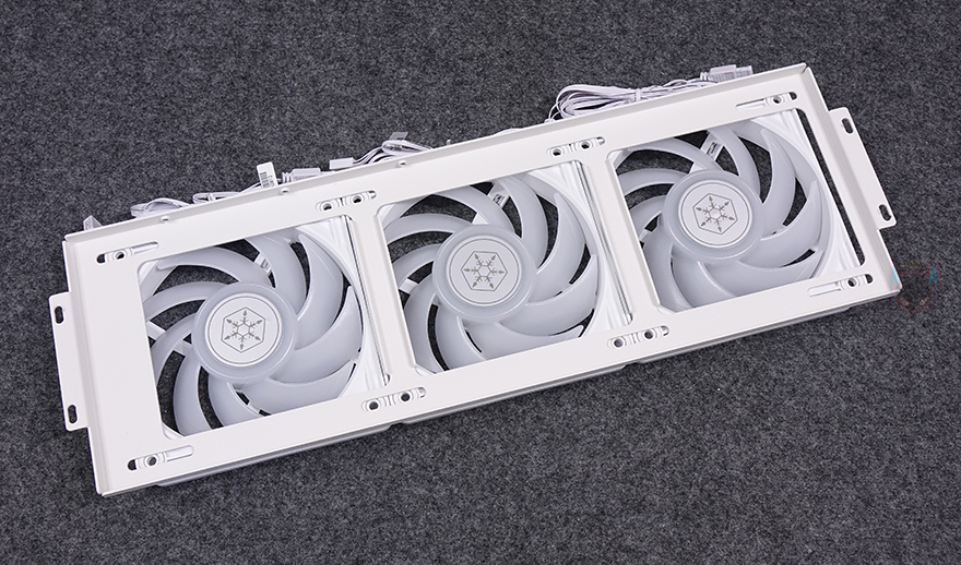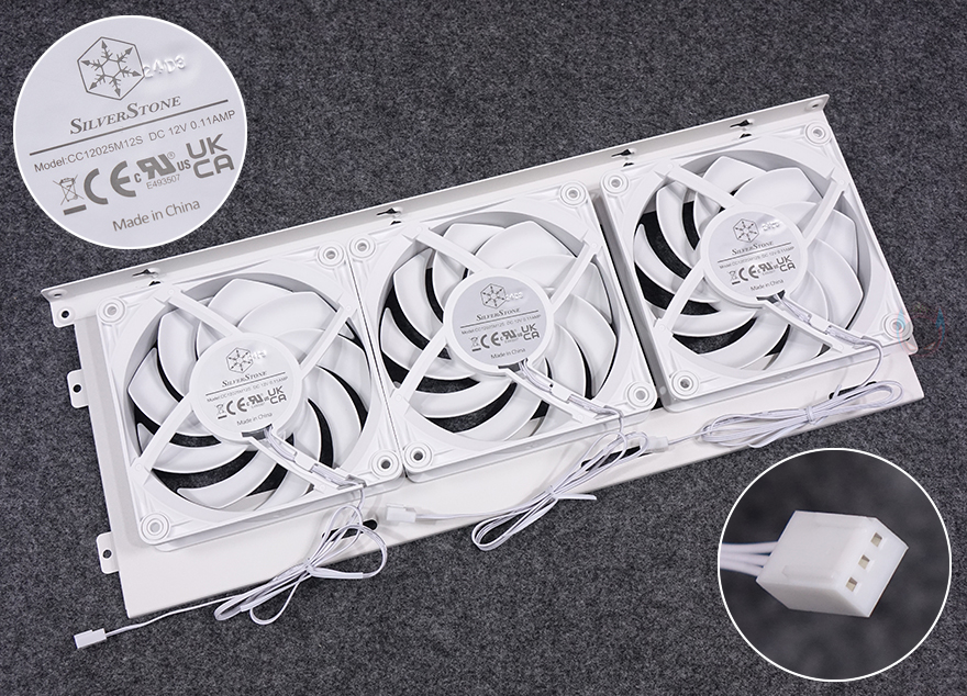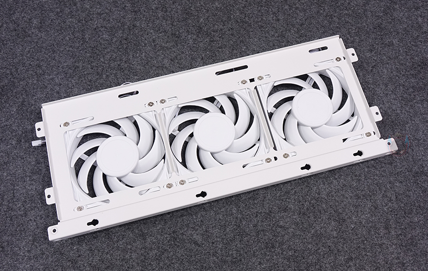 그리고, 내부 상단에 기본 장착된 팬 역시 앞서 언급했듯이 브래킷이 사용된 것으로 상단 브래킷 역시 측면과 상단에 고정된 나사를 풀면, 쉽게 분리가 됩니다. 일단, 상단 브래킷에 장착된 기본 팬 120mm는 자사의 VISTA 120F 모델로 작동 연결방식은 3 pin이며, 1500 RPM 속도로 작동합니다. 팬이 3개이기 때문에 기본 제공되는 3-in-1 연장 케이블을 사용해서 메인보드에 연결하면 동일한 속도로 사용할 수 있습니다. 또한, 상단 브래킷 같은 경우에는 120mm 팬 외에 140mm 팬도 최대 2개까지 장착할 수 있게 나사홀이 적용되어 있으며, 역시 수랭쿨러 사용 시에는 최대 360mm 라디에이터를 장착할 수 있죠. 그래서, 수랭쿨러 사용시에는 팬 위치를 상단이나 측면 중에 소비자가 선택할 수 있습니다.