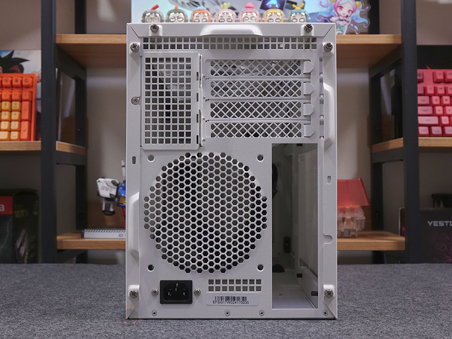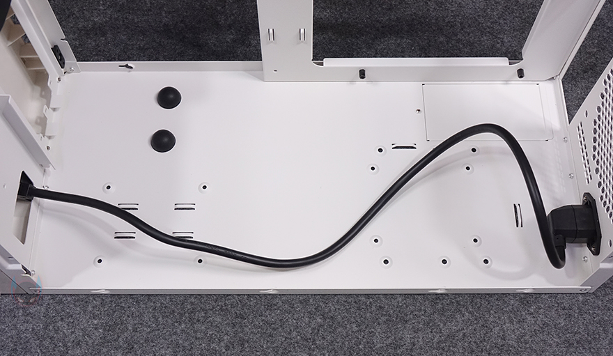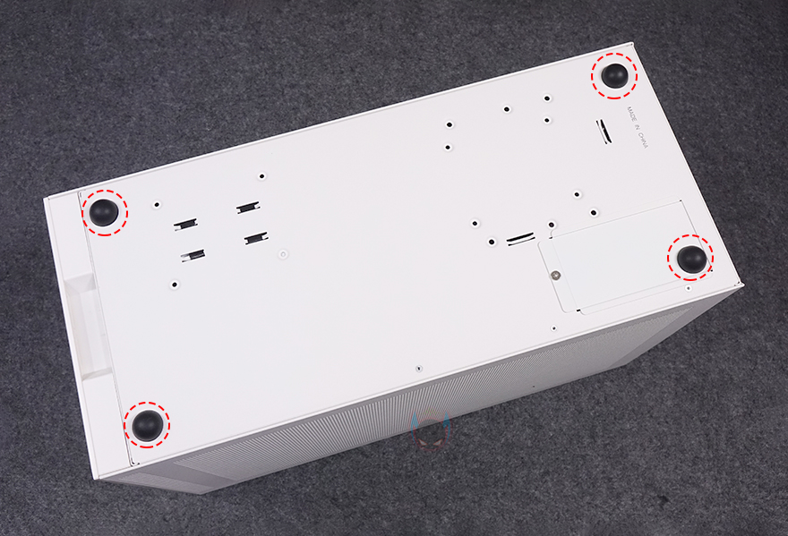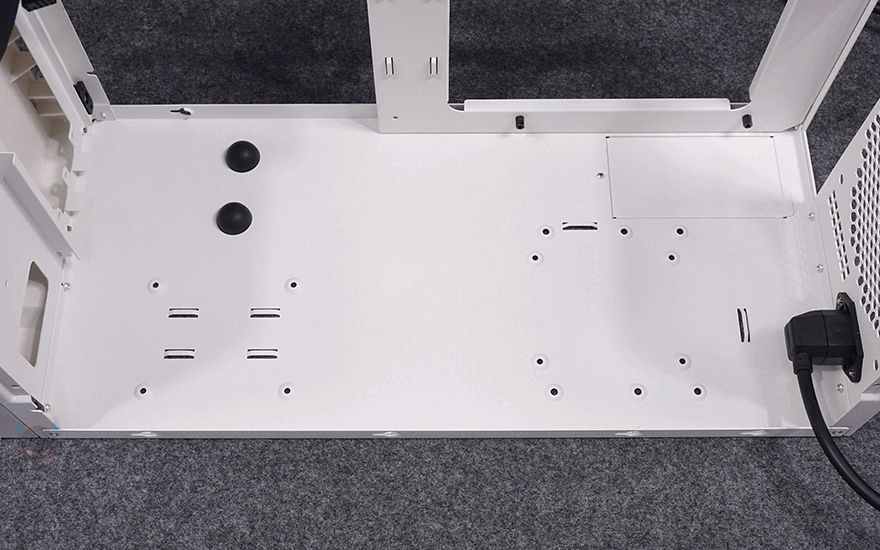 케이스 후면을 통해서는 내부 구조가 일반적인 구조가 아니라는걸 바로 알 수 있는데, 쉽게 말해 그래픽카드가 아랫 공간이 아닌 윗 공간에 적용되는 메인보드 위치가 거꾸로 장착되는 리버스 구조라는 걸 알 수 있습니다. 그래서, 후면 윗부분에는 미니타워 기준인 PCI슬롯이 4개 적용되어 있으며, 아래에는 후면 배기 역할로 벌집 모양의 에어홀 디자인과 함께 추가로 120mm 팬을 장착할 수 있게 나사홀이 적용되어 있죠. 끝으로, 케이스 밑바닥 부분에는 받침대가 미리 적용되어 있지 않고, 별도로 부착할 수 있는 고무 받침대를 제공해주고 있으며, 내부에서 확인하겠지만 하단에 저장장치도 추가로 장착할 수 있게 지원하고 있습니다. 그리고, 한쪽에는 커버도 적용되어 있는데, 뒤에 조립 부분에서 확인하겠지만, 메인보드와 파워서플라이 케이블을 연결할 때 이용되는 부분입니다.