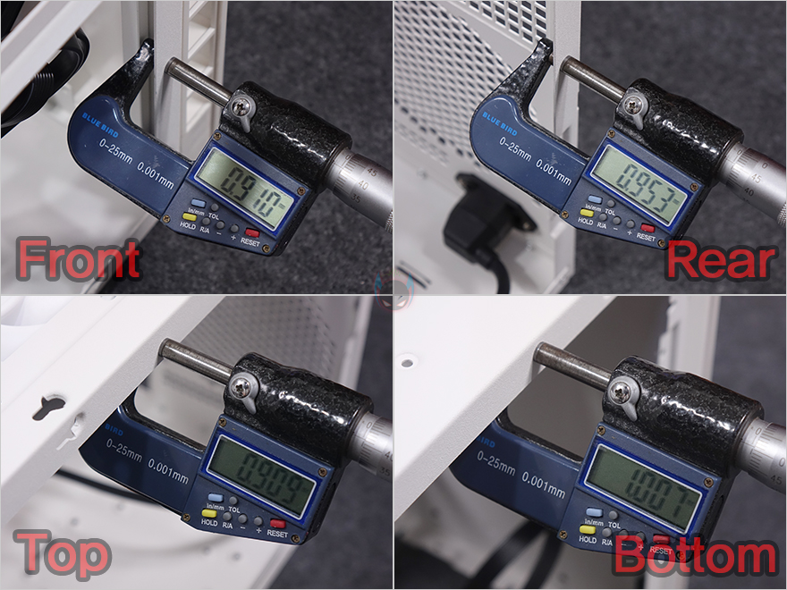 끝으로, 내부 하단을 보면, 앞서 언급했듯이 메인보드와 같은 위치에 왼쪽 자리는 파워서플라이 자리로 ATX 파워서플라이를 장착할 때 받침대 역할을 하는 고무패드가 기본 부착되어 있으며, 연장 전원선 케이블이 지나가는 자리에는 추가로 앞쪽 자리에 2.5인치 HDD/SSD 1개를 장착할 수 있고, 뒤쪽 자리에는 2.5인치 HDD/SSD 또는 3.5인치 HDD를 1개 장착할 수 있습니다. 그리고, SUGO 17 PC케이스에 사용된 새시의 두께를 부위별로 측정해 보면 0.9~1.0mm대인 것을 확인할 수 있죠. 미니타워 내구성을 생각해 충분히 두꺼운 새시를 사용했습니다.