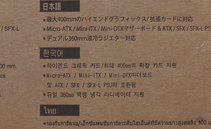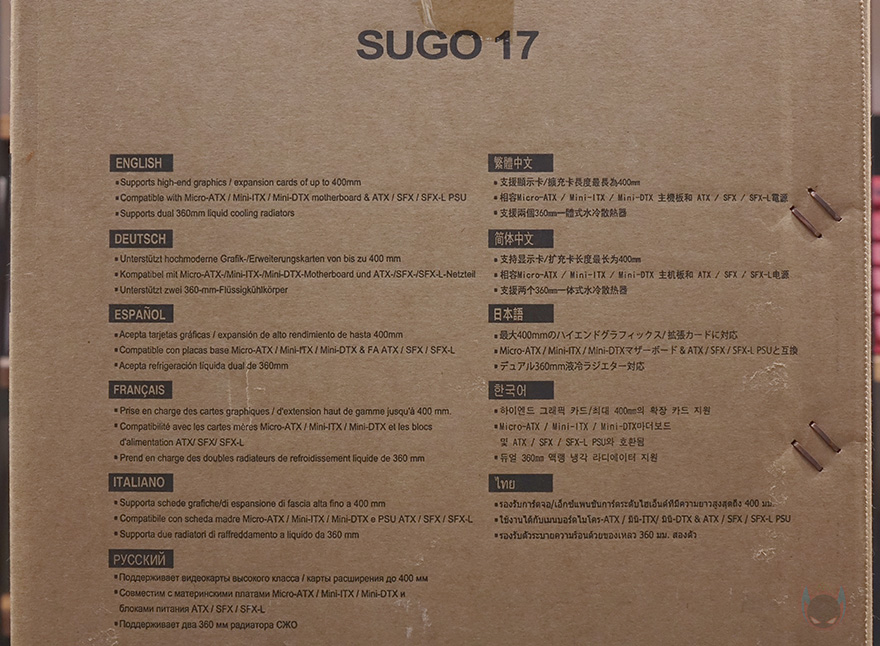 제품 박스부터 살펴보면, 전후면에는 심플하게 케이스 전면 이미지와 함께 모델명, 그리고 콘셉트 문구만 담고 있는데, 콘셉트 문구를 보면 '뛰어난 구성 요소를 수용할 수 있는 프리미엄 큐브'라는 표현을 사용했습니다. 시작에서 잠깐 언급했듯이 SUGO 시리즈는 미니타워 케이스 라인업으로 일반적인 Mini-ITX 메인보드뿐만 아니라 M-ATX 메인보드까지 장착할 수 있는 제품들로 많이 선을 보였는데, SUGO 17 역시 M-ATX 범위까지 지원하죠. 이는 바로 박스 측면에 표기된 제품의 기본 사양을 통해 확인할 수 있습니다. 그리고, 반대쪽 측면에는 각 나라별 언어로 제품의 주요 특징을 표기해 놨는데, 한국어도 포함되어 있죠.