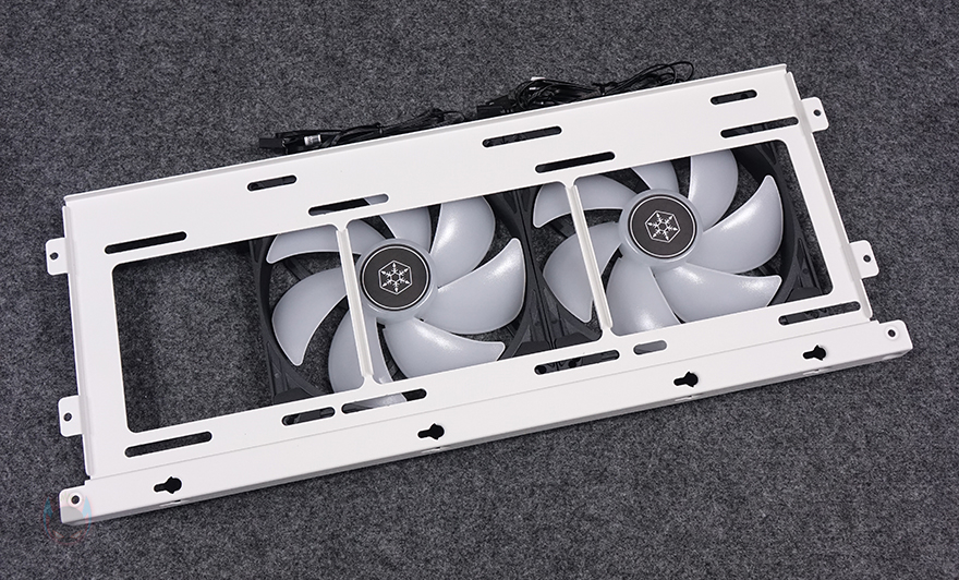 이제 실버스톤 SUGO 17 PC케이스의 내부를 살펴보는데, 큐브 형태를 가졌기때문에 일반적인 미니타워 구조와는 조금 다르지만 간단한 구조이기도 합니다. 일단, 전면 기준 오른쪽 측면에는 브래킷이 장착되어 있는데, 나사를 풀면 쉽게 분리가 되고, 브래킷에는 120mm 팬 최대 3개 또는 수랭쿨러 시 최대 360mm 라디에이터를 장착할 수 있습니다. 그래서, 앞서 외부에서 잠깐 언급했듯이 상단에 기본 장착된 팬을 측면으로도 위치 변경할 수 있는 거죠. 그리고, 브래킷 왼쪽 윗부분에는 지지대가 장착되어 있는데, 바로 그래픽카드 지지대로 바로 지지대 역할을 하는 건 아니고 제공되는 고무 패드를 사용할 수 있게 받쳐주는 역할을 합니다. 참고로, 지지대와 브래킷 모두 약간의 위치조절도 가능하게 나사홀을 길게 처리해 놨죠.