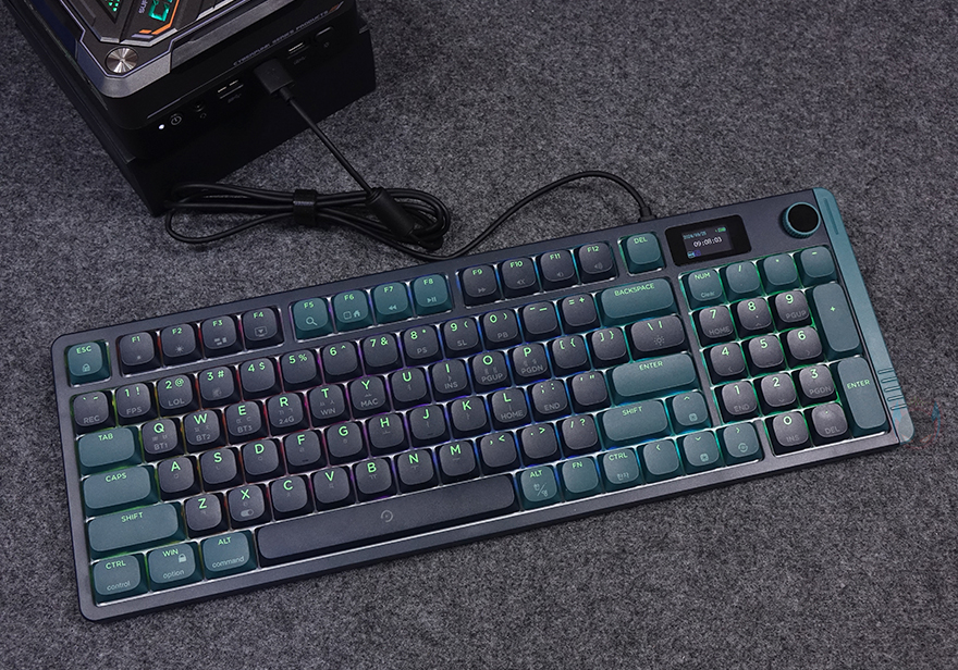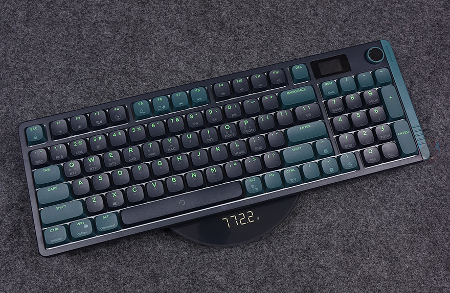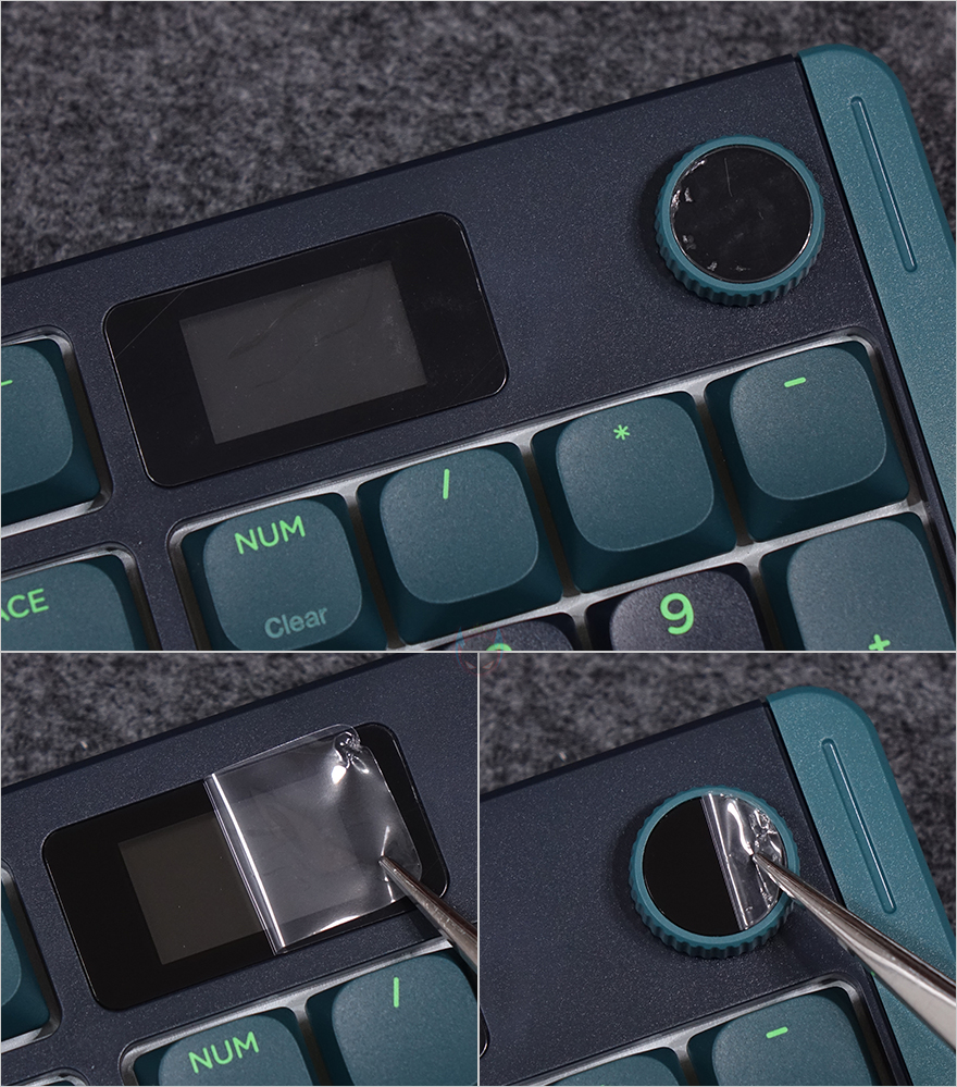 좀 더 자세하 살펴보면, 총 키 수는 95키로 요즘 트렌드인 풀-배열 104 키의 핵심이 숫자키패드와 방향키는 유지하면서 특수키를 줄여 키보드 사이즈를 줄인 형태입니다. 그래서, 키보드 오른쪽에 그 특성을 그대로 담고 있죠. 또한, 숫자 키패드 위에는 LCD 디스플레이와 다이얼 노브가 배치되어 있는데, 앞서 제품 박스에선 LED 스크린, 노브 버튼이라고 표기하고 있었죠. 좀 더 정확한 표현은 LCD 디스플레이와 다이얼 노브가 맞습니다. 화면 크기는 1.06인치이며, 디스플레이와 노브 모두 개봉 시에는 보호비닐이 부착되어 있죠. 뒤에서 확인하겠지만, 디스플레이가 적용된 다른 키보드 제품들처럼 DFS99도 LCD 디스플레이를 통해 연결상태, 기능 활성화 유무, 배터리 잔량, 날짜와 시간 등을 확인할 수 있습니다.