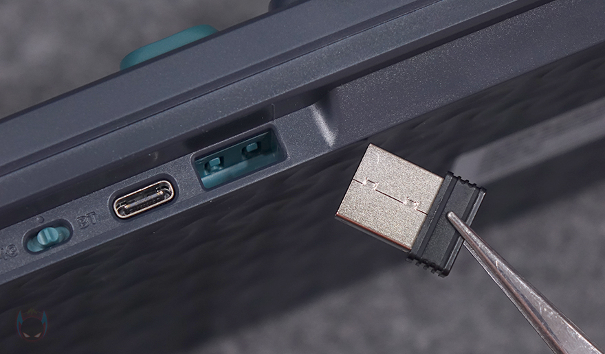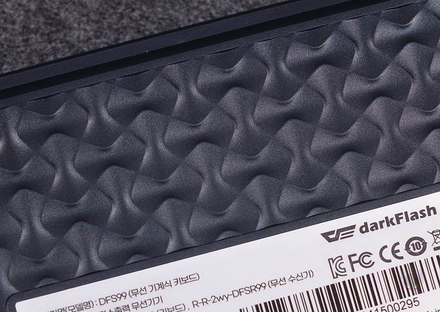 그리고, DFS99 키보드 전면 한쪽 정확히는 Delete 키 위치 전면에 유선시 사용되는 USB 전원 및 충전케이블과 연결되는 USB 타입 C 포트가 배치되어 있으며, 양쪽에 각각 블루투스/무선 2.4G 모드 스위치, 무선 2.4G 사용 시 이용되는 수신기가 수납되어 있습니다. 키보드 밑바닥 부분에는 입체감 있는 패턴 디자인을 적용했으며, 모서리 부근으로 미끄럼방지 패드가 부착되어 있으며, 앞쪽에는 2단 높낮이 받침대가 적용되어 있는데, 받침대에도 모두 패드가 부착되어 있습니다. 높낮이 조절이 가능하기 때문에, 측면에서 보면 충분히 높이에 따른 각도가 있어서, 사용자가 원하는 높이에서 설정해서 사용할 수 있죠. 끝으로, USB 전원 및 충전케이블은 1.5m 길이에 USB Type A to C 인터페이스를 가졌으며, 신호손실 최소화를 위해 노이즈 필터도 적용되어 있습니다.