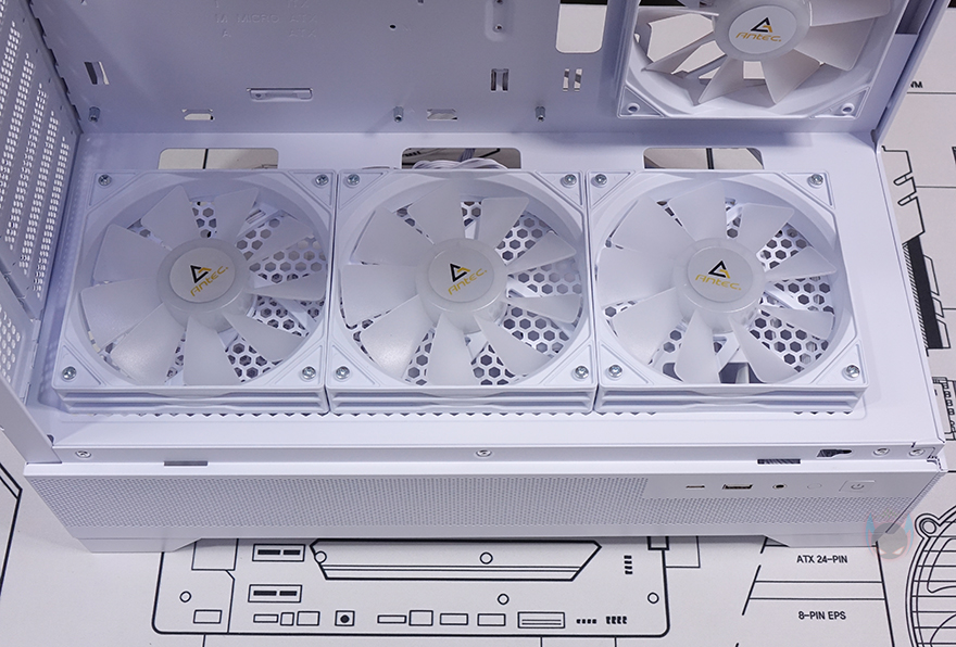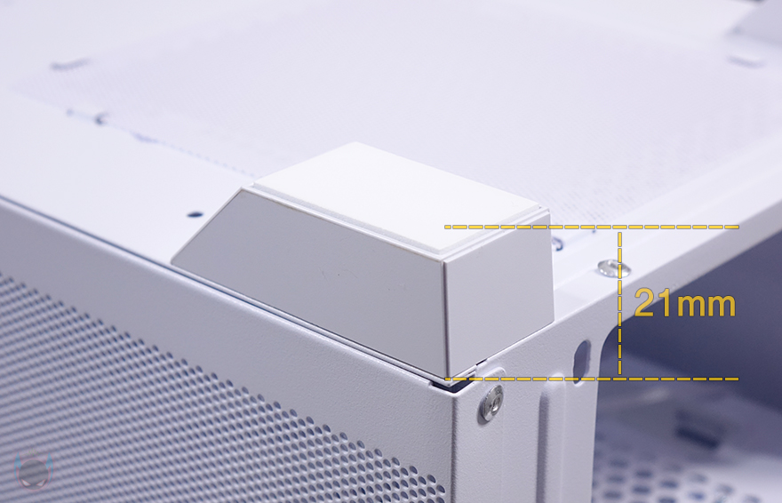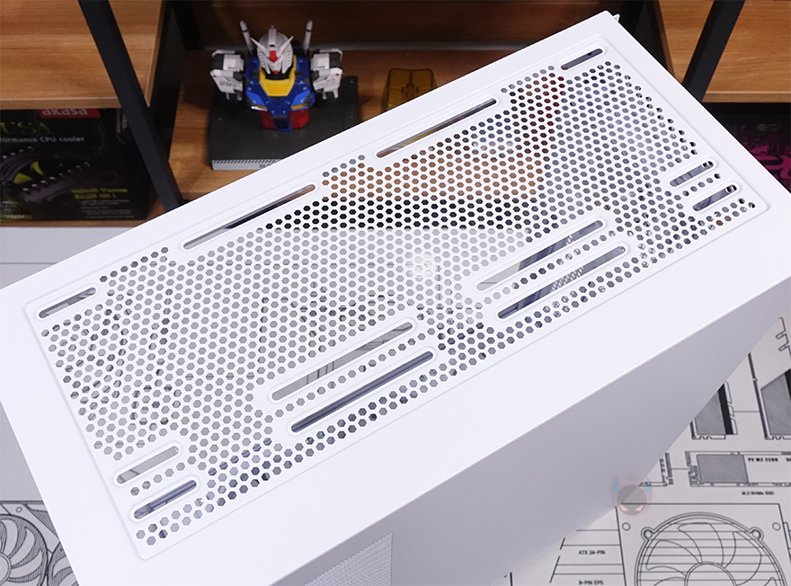 케이스 상단에는 자석방식의 분리형 먼지 필터가 적용되어 있으며, 필터는 분리하면 상단 쿨링시스템을 위한 벌집모양의 에어홀 처리와 함께 나사홀이 처리되어 있습니다. 팬을 장착할 때는 120mm 경우 최대 3개, 140mm 경우 최대 2개를 장착할 수 있으며, 수랭쿨러 사용시 라디에이터는 최대 360mm까지 장착할 수 있죠. 나사홀 길이가 길기 때문에 위치조절도 자유롭습니다.