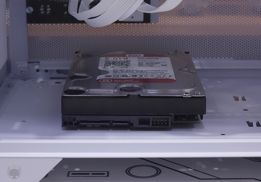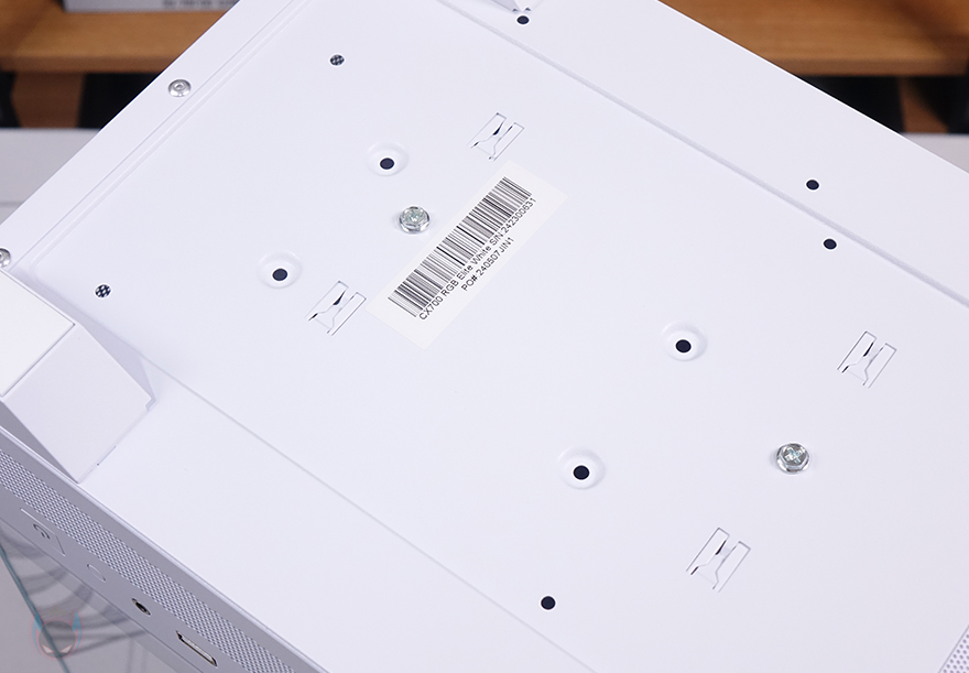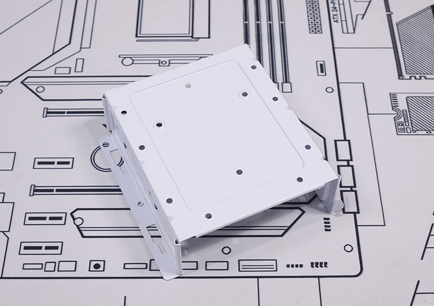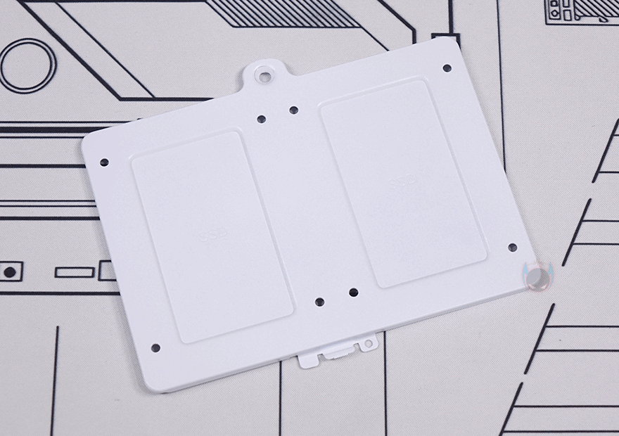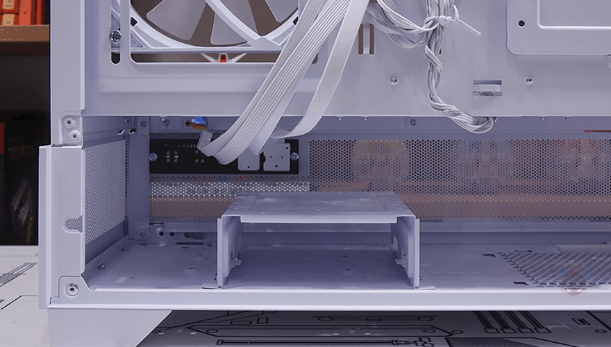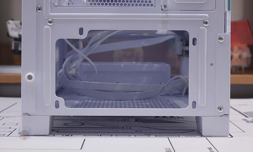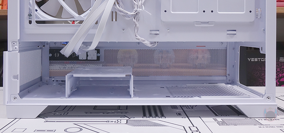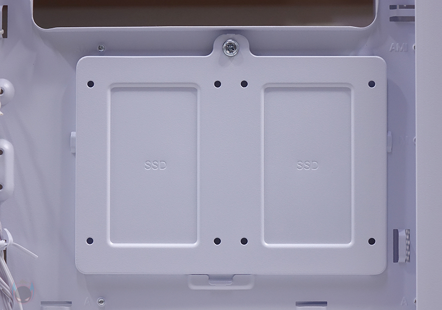 트레이 후면인 내부 후면을 살펴보면, CPU-cut-Out 바로 아래에는 2.5인치 HDD/SSD를 장착할 수 있는 브래킷이 장착되어 있는데, 나사를 풀면 쉽게 분리가 되고, 최대 2개까지 장착할 수 있습니다. 그리고, 내부 하단에는 앞자리에 HDD 베이가 장착되어 있는데, 외부 밑바닥에서 확인했듯이 고정된 나사 2개를 풀면 베이는 쉽게 분리가 되고, 베이에는 안쪽에 3.5인치 HDD 1개, 베이 상단에 3.5인치 HDD 또는 2.5인치 HDD/SSD 1개를 장착할 수 있습니다. 만약, 베이를 사용하지 않는다면, 베이를 분리하고 내부 하단 자체에 3.5인치 HDD를 장착할 수 있죠. 그리고, 하단 뒷자리인 파워서플라이 자리에는 받침 역할과 진동 소음을 줄이도록 패드가 부착되어 있으며, 케이스 버튼과 포트 케이블 역시 케이스 색상에 맞춰 화이트 색상으로 적용했습니다.