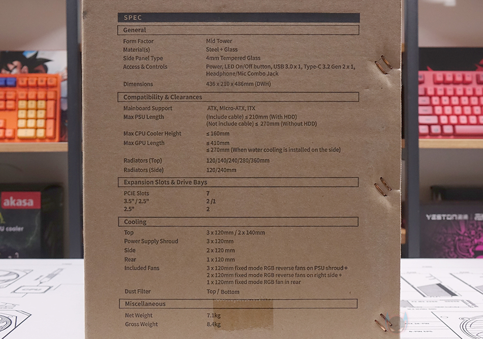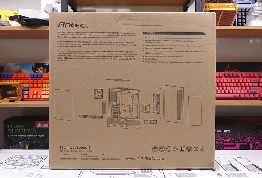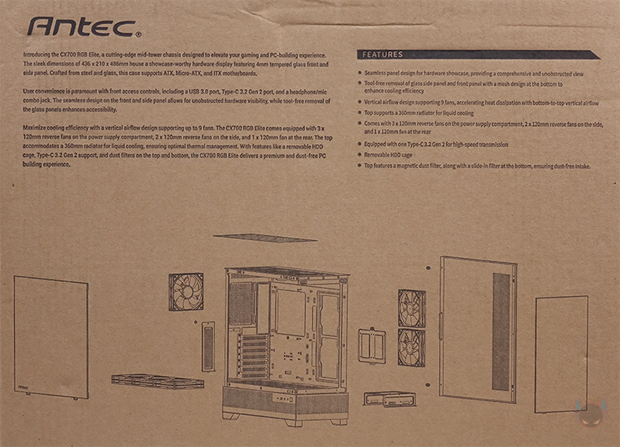 제품박스부터 살펴보면, 전면에는 모델명과 함께 제품 이미지를 담고 있어서 제품 디자인을 간접적으로 먼저 확인할 수 있는데, 시작에서 잠깐 언급했듯이 전형적인 미들타워 형태에 전면과 측면 2면에 강화유리가 적용된 컴퓨터 어항케이스라는 걸 알 수 있습니다. 그리고, 모델명 옆에는 색상 구분도 표시해 놨으며, 반대쪽 박스 후면에는 안텍 다른 PC케이스 제품들과 마찬가지로 CX700 RGB Elite 제품 소개와 주요 특징을 담고 있으며, 아래에 분해도 이미지를 담고 있습니다. 박스 한쪽 측면에는 제품의 기본 사양을 표기해 놨는데, 재질, 크기, 포트, 규격 지원을 비롯해 CPU 쿨러 높이, 그래픽카드 길이까지 상세하게 표기되어 있기 때문에 오프라인에서 구입할 때도 충분히 정보를 얻을 수 있습니다.
