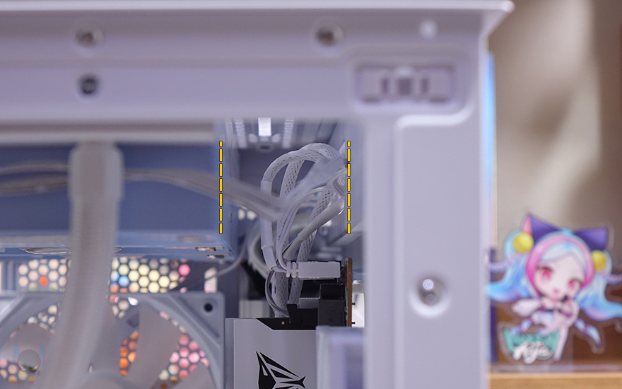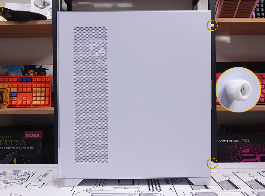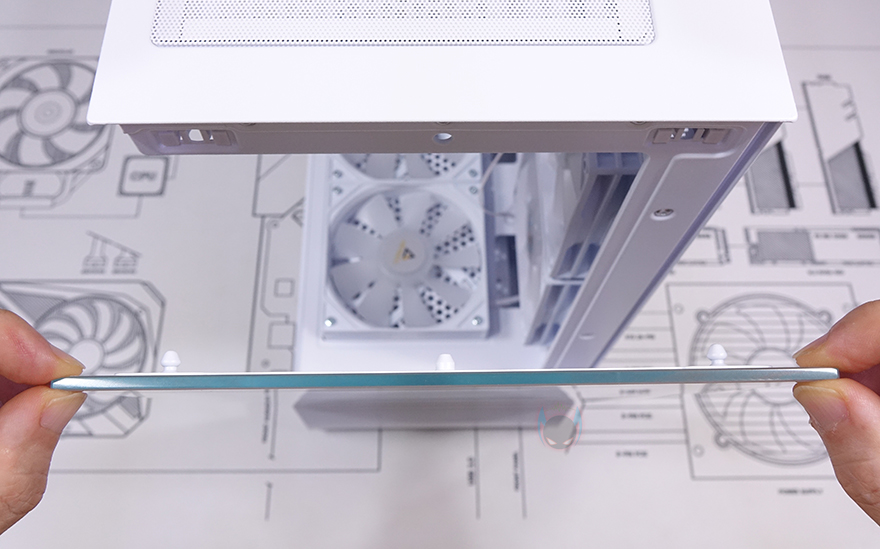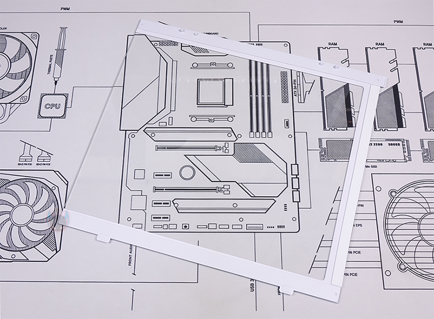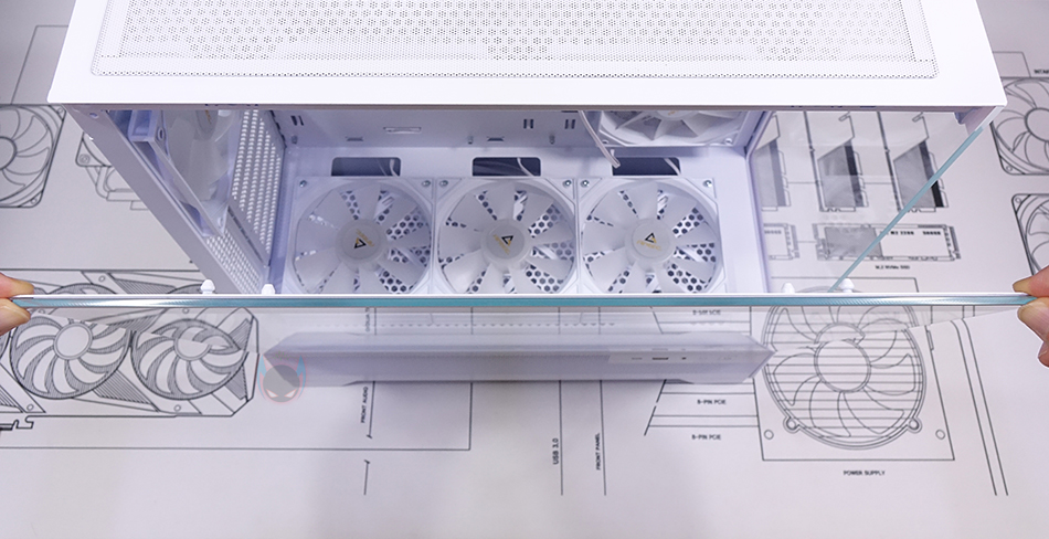 컴퓨터 어항케이스 콘셉트를 가졌기때문에 전면 패널은 강화유리이고, 탈착 방식은 볼-헤드핀 클램프 방식으로 패널 윗부분에 적용했으며, 아래는 걸림 장치가 적용해 분리 시 편의성을 가지도록 했습니다. 그리고, 강화유리 패널을 제외한 나머지 케이스 아랫부분은 메쉬 디자인으로 에어홀처리를 해놨습니다.