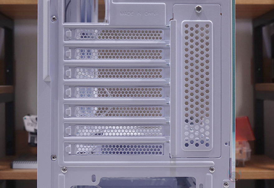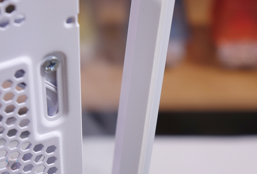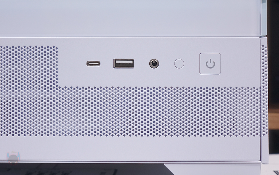 사이드 패널 역시 전면 기준 왼쪽 패널은 강화유리를 적용하고 있으며, 역시 볼-헤드 클램프 방식으로 탈착해서, 후면에 별도의 고정 나사는 없습니다. 또한, 패널 아랫부분에는 역시 걸림 장치를 적용해 놨으며, 후방향에는 패널을 닫을 때 후면 프레임과 맞닿는 부분에는 강화유리 충격보호를 위해 패드까지 적용되어 있죠. 그리고, 왼쪽 측면 역시 강화유리를 패널을 제외한 나머지 케이스 아랫부분은 메쉬 디자인 에어홀처리와 함께 앞부분에 버튼 및 포트가 배치되어 있는데, 앞에서부터 전원 버튼, LED 버튼, 오디오/마이크 포트, USB 3.0 포트, USB 3.2 Gen2 타입 C 포트순으로 배치되어 있죠. 반대편인 오른쪽 패널은 새시 패널이며, 후면 나사를 이용한 고정방식에 앞부분에는 내부 측면 쿨링시스템 효과를 위해 역시 메쉬 디자인의 에어홀 처리를 해놨습니다. 참고로, 전면과 측면 메쉬 디자인 에어홀 구멍은 모두 1.2mm로 촘촘하기 때문에 내부에 별도의 먼지 필터는 적용되어 있지 않습니다.