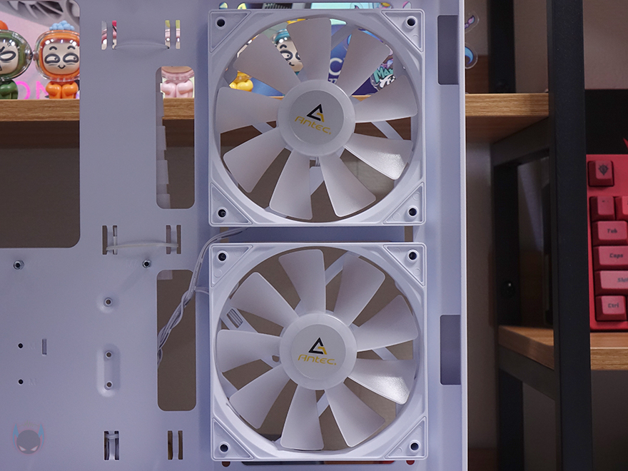 트레이 앞방향 측면에는 측면 쿨링시스템으로 기본 120mm 팬이 장착되어 있는데, 모두 리버스 팬인 동시에 RGB 팬입니다. 물론, 팬을 제거하면 측면에 수랭쿨러 라디에이터 240mm를 장착할 수 있습니다. 그리고, 트레이 하단인 파워서플라이 커버부분에도 하단 쿨링시스템으로 120mm 팬이 3개 장착되어 있는데, 역시 모두 리버스 팬이며 RGB 팬입니다. 또한, 내부 후면 배기역할의 120mm 팬도 RGB 팬이죠. 참고로, 팬 작동은 모두 P-ATA 4핀 방식이며, 아래 PCI 슬롯가이드는 착탈식으로 적용되었습니다.