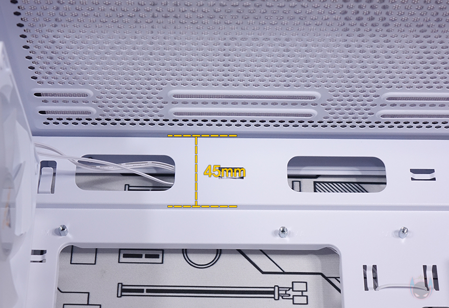 이제, 안텍 CX700 RGB Elite PC케이스 내부를 살펴보는데, 컴퓨터 어항케이스 콘셉트를 가졌기때문에, 전면과 측면 강화유리가 만나는 지점부분에는 프레임이 없습니다. 그래서, 내부 프레임 구조가 단단하지 않으면 강화유리 만나는 지점의 상판 부분이 쳐지는 경우가 발생할 수 있죠. 하지만, CX700 RGB Elite 같은 경우에는 프레임이 없는 부분에 쳐지는 부분 없이 상판이 잘 유지되는 걸 확인할 수 있습니다. 그리고, 메인보드가 장착되는 트레이 부분을 살펴보면, CPU-cut-Out을 비롯해 주변으로 케이블 정리를 할 수 있게 선정리-홀이 처리된 것을 확인할 수 있으며, 앞서 외부 후면에서 잠깐 언급했듯이 상단 공간이 꽤 높게 확보된 것을 확인할 수 있죠. 실제로 약 45mm 공간정도를 확보하고 있어서 상단에 수랭쿨러 라디에이터를 장착했을 시에도 파워서플라이 케이블을 넘기기에 큰 어려움이 없습니다.