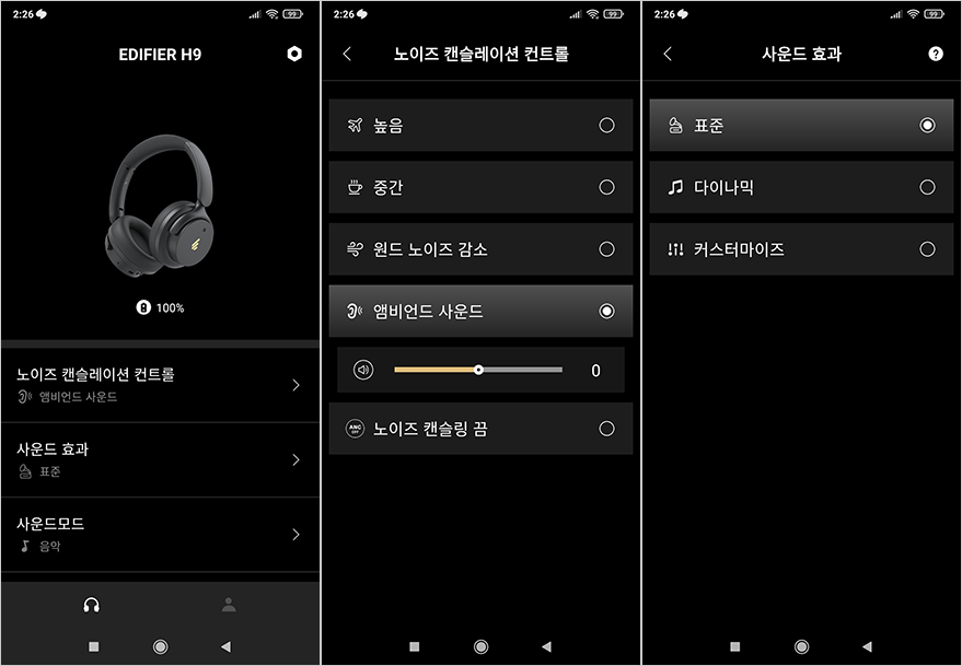 H9 무선 헤드폰 역시 W800BT Pro와 마찬가지로 에디파이어의 공용앱 ConneX를 지원합니다. 블루투스 연결이 정상적으로 이루어지면, 앱을 실행했을 때 메인화면에서 H9 장치 연결상태와 함께 배터리 잔량을 확인할 수 있고, 아래에 메인 메뉴로 노이즈 캔슬레이션 컨트롤/사운드 효과/사운드모드를 확인할 수 있죠. 노이즈 캔슬레이션 컨트롤은 ANC 기능과 주변 소음 모드 조절을 할 수 있으며, 사운드 효과는 표준/다이나믹/커스터마이즈 3가지 모드를, 사운드모드 역시 음악/게임/공간음향 3가지 모드를 지원해주고 있습니다. 이 밖에도 디바이스 설정에서 제어설정 즉 방금 언급했던 이어 컵의 버튼 기능들을 사용자가 따로 설정할 수 있으며, 헤드폰 주변 분실 시 위치 알림, 전원 및 모드 전환 시 나오는 음성 신호음 볼륨조절, 전원 예약종료시간 등을 설정할 수 있습니다.