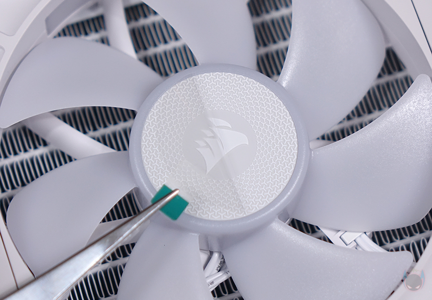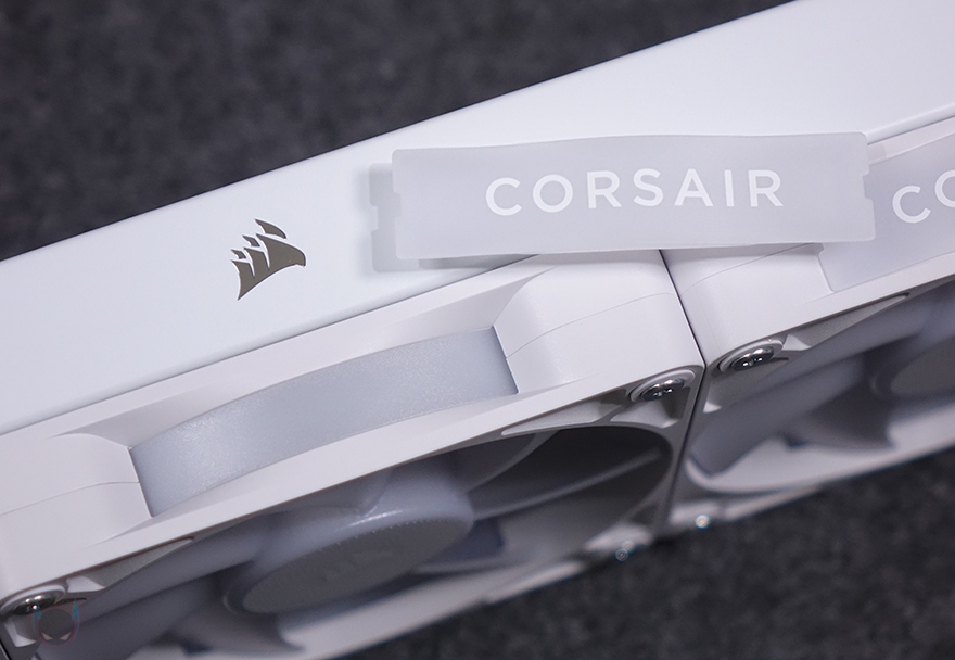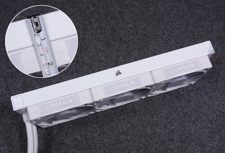 라디에이터에 팬이 기본 장착된 상태에서 전체 두께는 52mm로 팬 25mm를 빼면 27mm 라디에이터 두께라는걸 알 수 있습니다. 가장 기본적인 라디에이터 두께를 가진 거죠. 그리고, 라디에이터 측면에는 커세어 로고를 네임플레이트방식으로 적용해 놨으며, 팬 측면에 있는 CORSAIR 로고 부분은 탈착식으로 사용할 수 있습니다. 참고로, 반대편 측면 플레이트에는 로고가 없기 때문에 사용자가 커스텀 디자인을 적용해 사용할 수 있습니다. 그리고, 라디에이터의 방열핀은 휨/구김 없이 일정 간격으로 촘촘하게 마감되어 있죠.