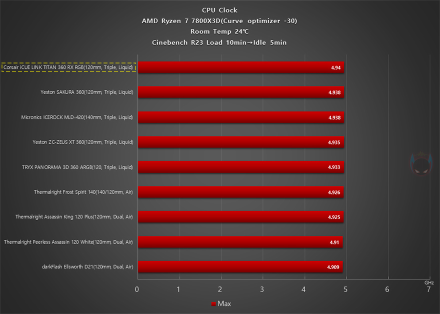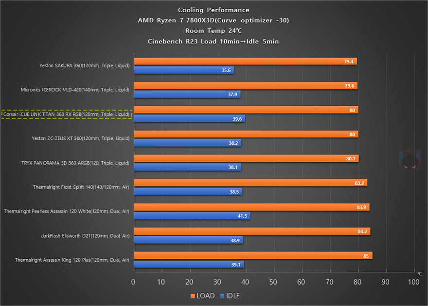 이제 끝으로, iCUE LINK TITAN 360 RX RGB 일체형 수랭쿨러의 쿨링 성능을 확인해 보는데, 최근 인텔/AMD CPU 모두 기본 부스트 클럭이 높게 작동하기 때문에, 예전처럼 소비자가 수동적으로 오버클럭을 하는 매리트는 많이 사라졌습니다. 현재, 가장 인기 있는 CPU라 할 수 있는 AMD 라이젠 7 7800X3D만 해도 오버클럭 지원을 하지 않죠. 그래서, 라이젠 7 7800X3D CPU를 사용해 커브드옵티마이저(-30)를 적용해서, Cinebench R23을 10분간 실행한 과부하 100% Load 상태일 때와 이후 5분간 Idle 상태일 때의 CPU 온도와 팬 속도와 소, 그리고 냉각 성능에 따른 CPU 최대 클럭 작동을 확인해 봤습니다. 참고로, 다른 CPU 쿨러들과 비교를 위해 써멀 그리스도 동일하게 사용했습니다.