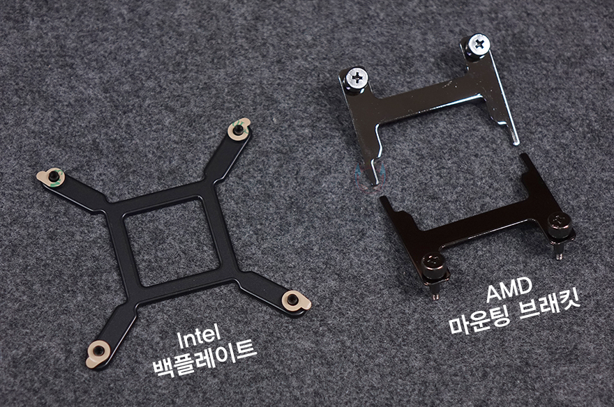 끝으로, CPU와 맞닿는 베이스부분에는 기본적으로 인텔용 마운팅 브래킷이 장착되어 있으며, 브래킷은 슬라이딩 방식으로 분리/장착할 수 있어서, AMD CPU를 사용할 때는 AMD용 브래킷으로 변경해야 합니다. 그리고, 베이스에는 기본 써멀컴파운드가 도포되어 있습니다.