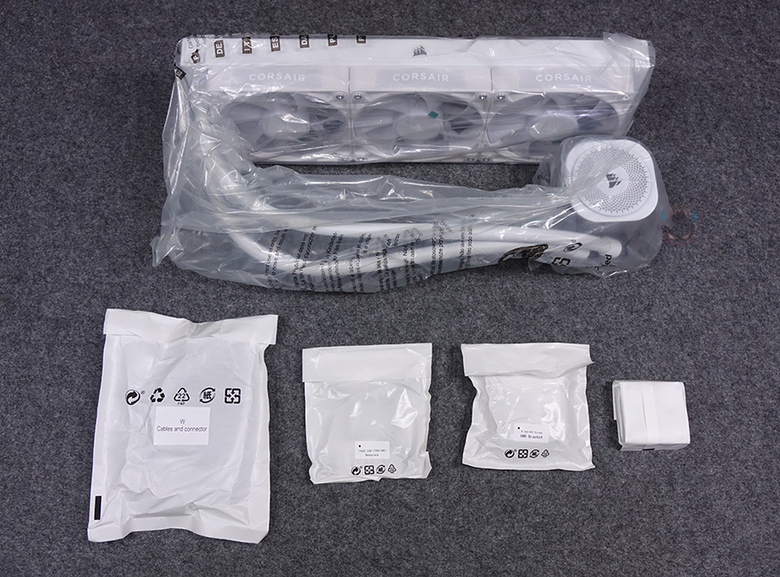 박스를 열어보면, 오픈 과정에서 설치 가이드 안내 문구를 확인할 수 있는데, iCUE LINK TITAN 360 RX RGB 제품은 별도의 설명서 제공없이 QR코드를 통한 웹에서 설치가이드(바로 보기)를 참고할 수 있습니다. 제품 포장은 쿨러는 비닐 포장, 나머지 구성품들은 종이 포장재를 사용했으며, 제품 구성에는 iCUE LINK TITAN 360 RX RGB 일체형 수랭쿨러, 인텔용 백플레이트, AMD용 브래킷, 팬 및 라디에이터 나사 및 와셔들, iCUE Link 허브, 600mm 스트레이트&90˚ iCUE Link 케이블, 600mm 90˚ iCUE Link 케이블, 250mm 90˚ iCUE Link 케이블, 800mm 테크 케이블, 150mm PCIe 전원 케이블, 500mm 마이크로 USB 2.0 케이블, 보증서로 이루어져 있습니다.