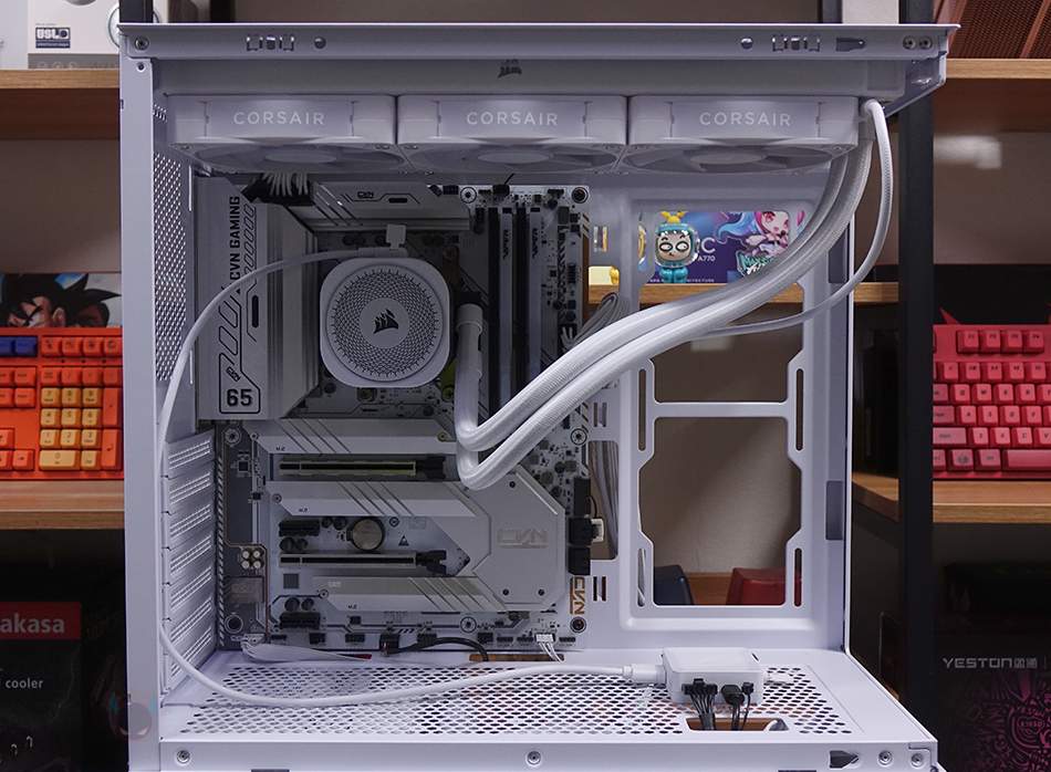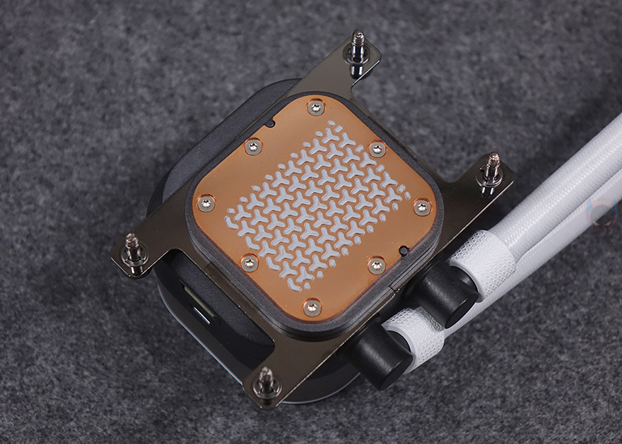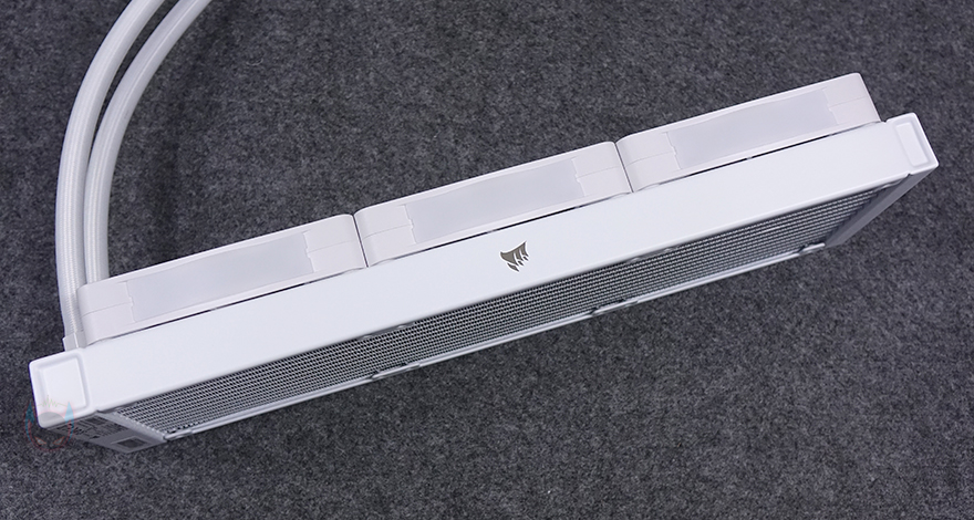 허브장치까지 연결을 마친 후, PC를 켜면 바로 라디에이터에 장착된 RX RGB 팬과 워터블록에서 기본 RGB 라이트 효과를 확인할 수 있습니다. 그리고, 앞서 확인했듯이 워터블록의 상판 로고 부분은 탈착식 플레이트라 쿨러 위치에 따라 언제든지 로고 전면으로 배치할 수 있습니다. 또한, 라이트 밝기도 일반적인 RGB처럼 단조롭게 과하지 않으며, 파스텔처럼 은은한 감성적인 느낌이라 눈에 들어오는 시각효과 피로감도 적습니다.