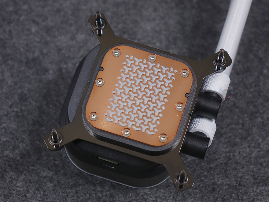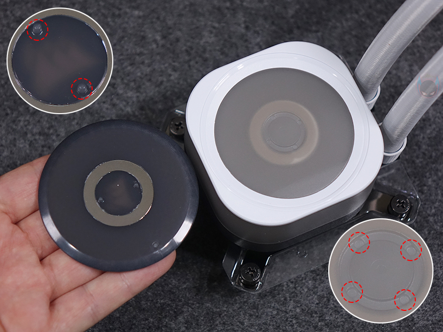 워터블록은 개봉시 상단 로고 부분에 보호비닐이 부착되어 있으며, 로고 부분은 자석방식의 분리형 플레이트로 플레이트 안쪽 돌기와 펌프 캡 상단 4개의 홈에 따라 90˚ 방향씩 로고 방향을 전향할 수 있습니다. 그리고, 플레이트 아래인 펌프 캡 부분은 모듈방식으로 분리할 수 있는데, 기본 캡 외에 별도로 그루브, VRM 팬, LCD 스크린 캡 모듈을 판매하고 있어서 사용자가 언제든지 원하는 취향으로 변경할 수 있죠. 내부에 포고핀(Pogo-pin)도 확인할 수 있는데, VRAM 팬이나 LCD 스크린 캡 모듈을 장착했을 때 이용됩니다. 커세어를 이렇게 펌프 캡을 교체할 수 있는 방식을 CapSwap이라고 부르고 있죠. 그리고, 펌프 안에는 20개의 RGB LED가 내장되어 있습니다.