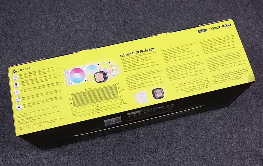 제품 패키지 형태는 박스 전체까지 밀봉된 상태로 소비자입장에선 좀 더 판매 제품에 신뢰를 가질 수 있습니다. 제품 박스를 좀 더 살펴보면, 상단에는 제품 이미지와 함께 모델명 그리고 iCUE LINK 지원 표기를 확인할 수 있죠. 박스 한쪽 측면에는 좀 더 큰 이미지도 제품 이미지를 확인할 수 있고, 올해 CES 2024에서 혁신상을 받은 제품이라는 것도 알 수 있죠. 반대쪽 측면에는 제품의 주요 특징을 언급하고 있는데, 이 제품의 가장 큰 특징 중 하나인 커세어 자체 펌프 설계의 3상 모터 기술 플로우드라이브 쿨링엔진(FlowDrive cooling engine), 마그네틱 돔 베어링방식의 RX RGB 팬, 펌프에 내장된 20개의 RGB LED, 펌프 캡을 교체할 수 있는 CapSwap 모듈 디자인, 최신 CPU 소켓 지원을 언급하고 있습니다. 바로 옆에는 제품의 기본 사이즈 표기도 확인할 수 있죠. 그리고, 제품의 기본 사양 및 제품 구성품 목록은 박스 밑면에서 확인할 수 있습니다.