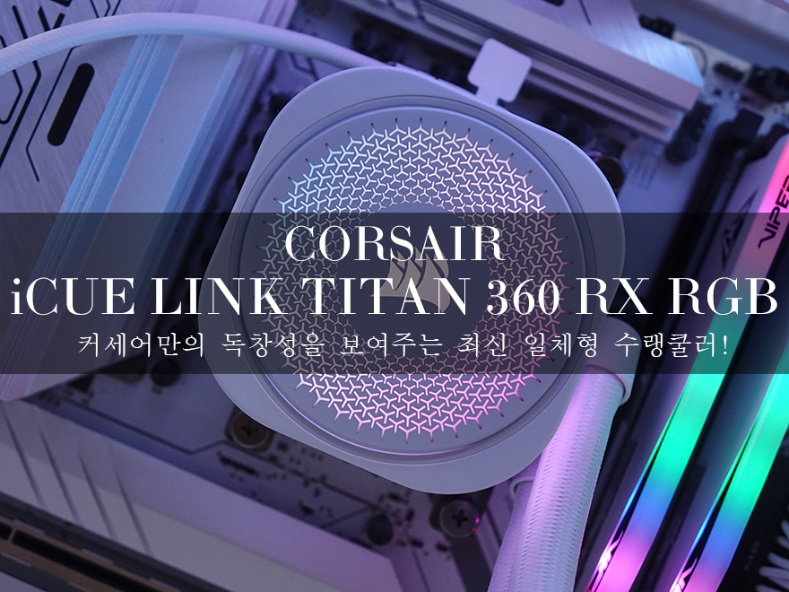 CPU 쿨러시장은 공랭과 수랭 2가지로 나뉘고 있죠. 공랭과 수랭 각각 장단점이 있지만, 고사양 조립 PC를 맞추는 경우에는 점점 수랭쿨러를 많이 선택하고 있는 추세입니다. 국내 PC시장에서 오랫동안 활동하고 있는 미국의 대표적인 PC하드웨어 브랜드 커세어(CORSAIR) 역시 예전부터 CPU 쿨러 제품군을 갖추고 있었습니다. 특히, 수랭쿨러 제품 같은 경우에는 RGB 효과가 추가되면서, 커세어의 RGB 컨트롤 및 시스템 모니터링 소프트웨어 iCUE 지원으로 확장되었죠. 그리고, 최근에는 커세어만의 쿨링시스템을 갖출 수 있는 허브 장치가 포함된 iCUE Link를 선보이면서 PC케이스, 쿨링팬, 그리고 수랭쿨러 제품군까지 적용되었습니다. 그래서, 오늘은 이 iCUE Link 허브가 추가된 커세어의 가장 최신 수랭쿨러 제품을 만나보는데, 바로 iCUE LINK TITAN 360 RX RGB입니다. 그럼, 커세어 iCUE LINK TITAN 360 RX RGB 일체형 수랭쿨러를 한 번 살펴보도록 하죠.